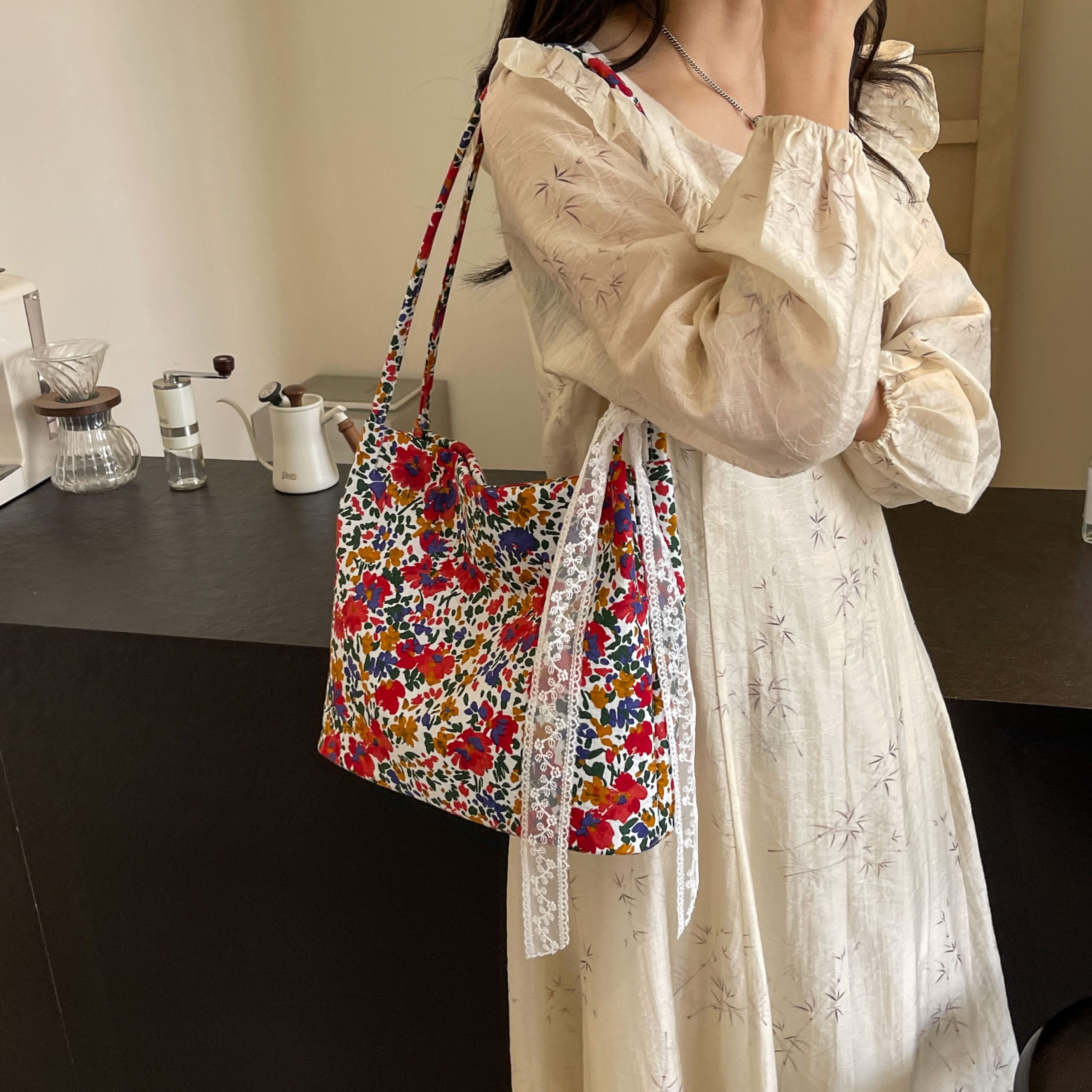 Woven/Floral Texture Lace Bow Tote Bag