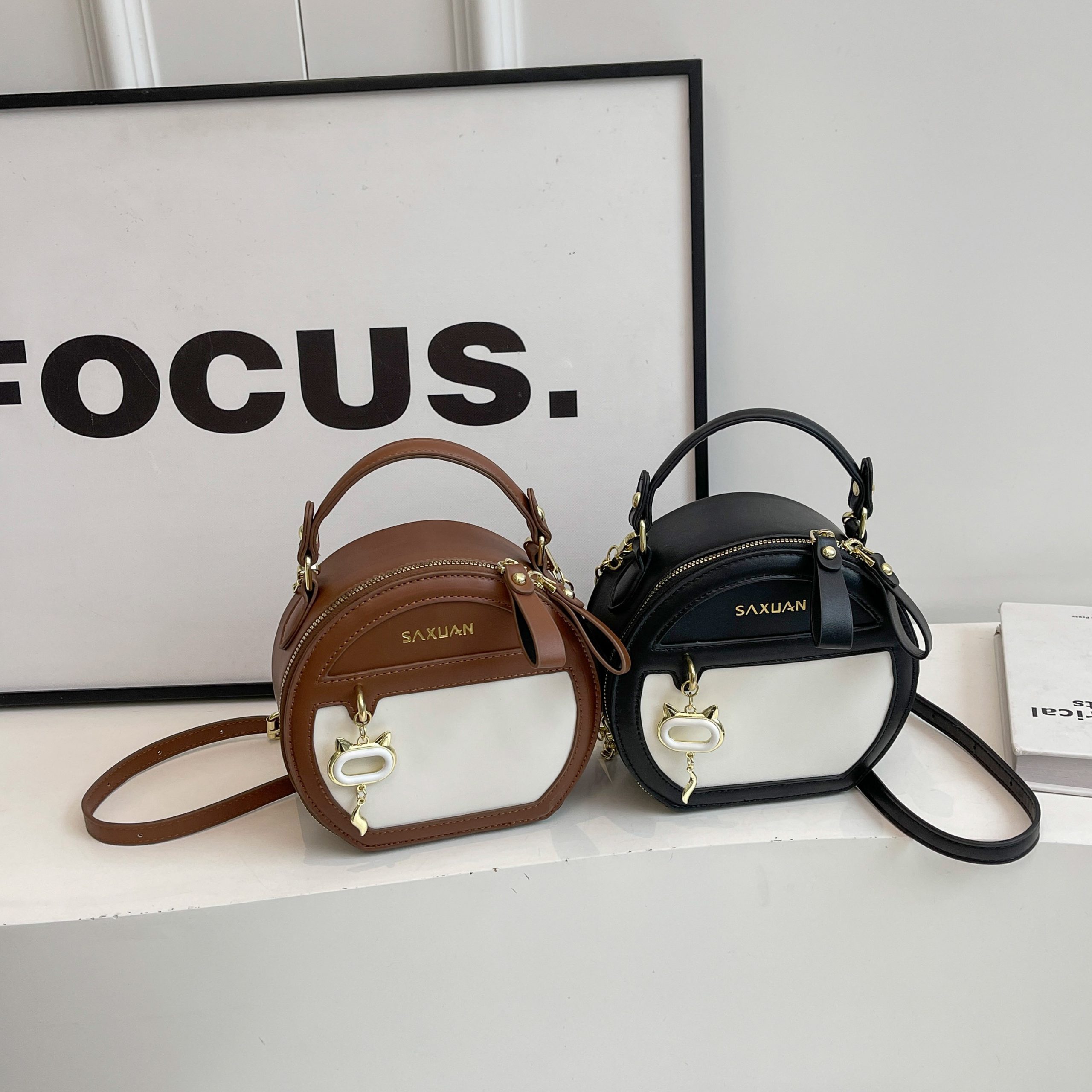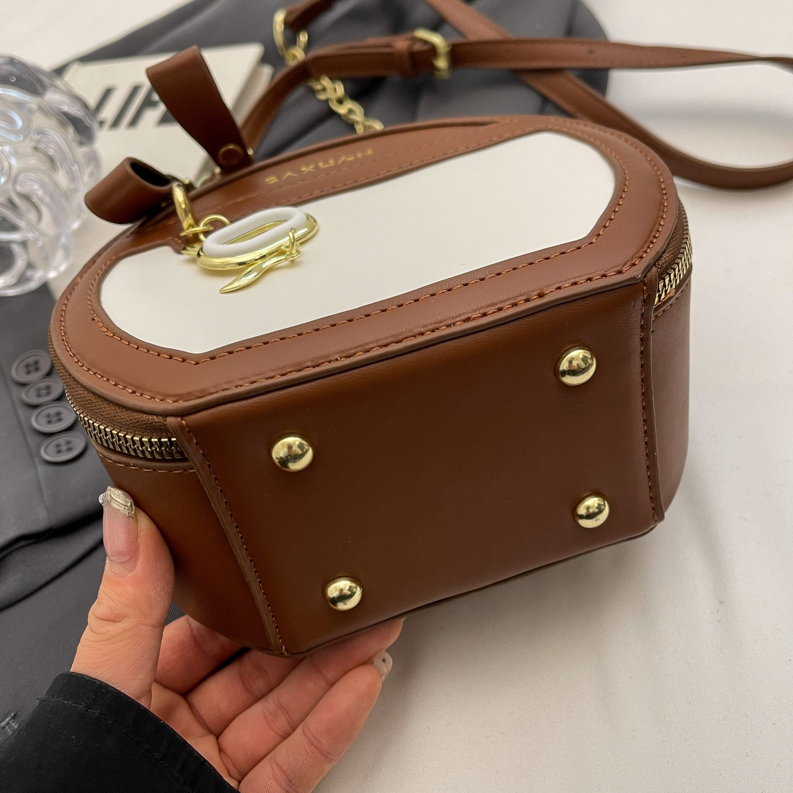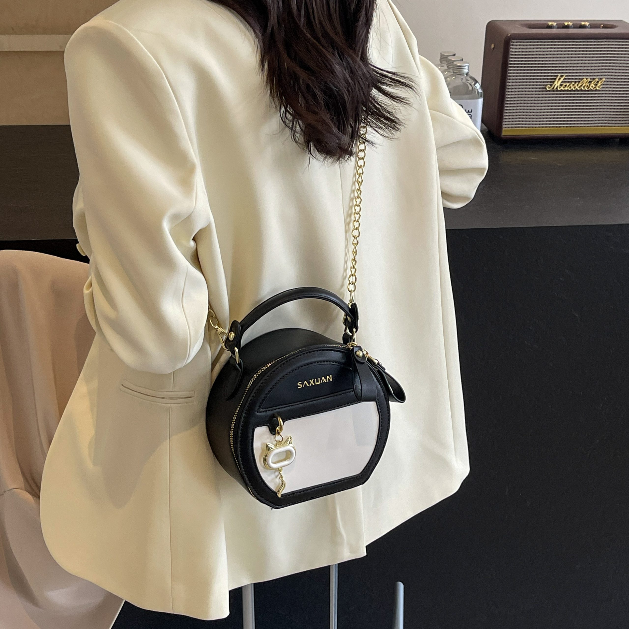 Exquisite aesthetics interpreted by color-block round silhouette, texture layers woven by metal chain and leather strap, logo charm highlights details—a high-end small idea for daily styling.#2137