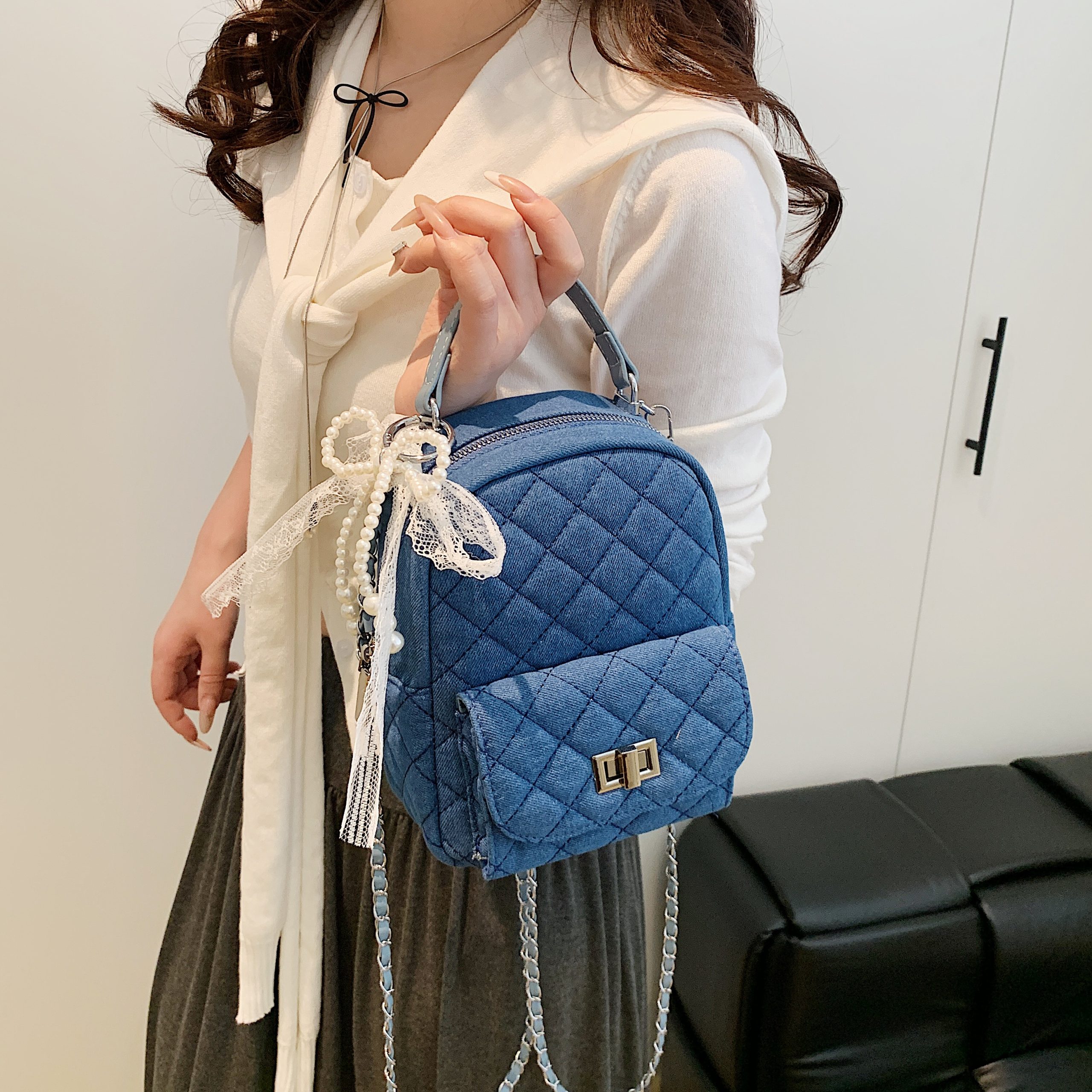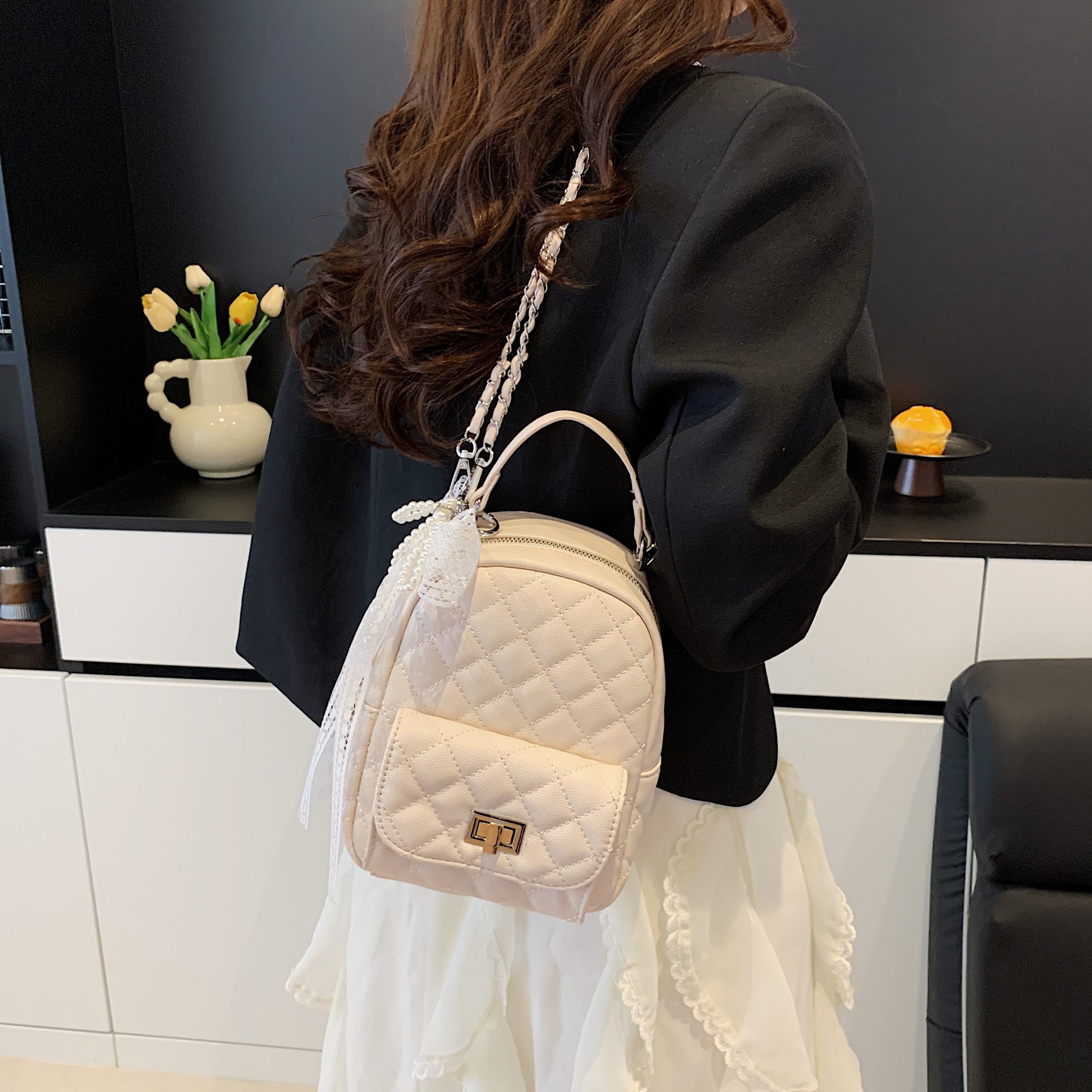 A blend of vintage glamour and modern versatility: this quilted mini backpack pairs iconic diamond stitching with a sleek chain strap, elevated by delicate lace details. It transitions effortlessly from a compact backpack to a chic crossbody, merging timeless charm with everyday practicality.#2619