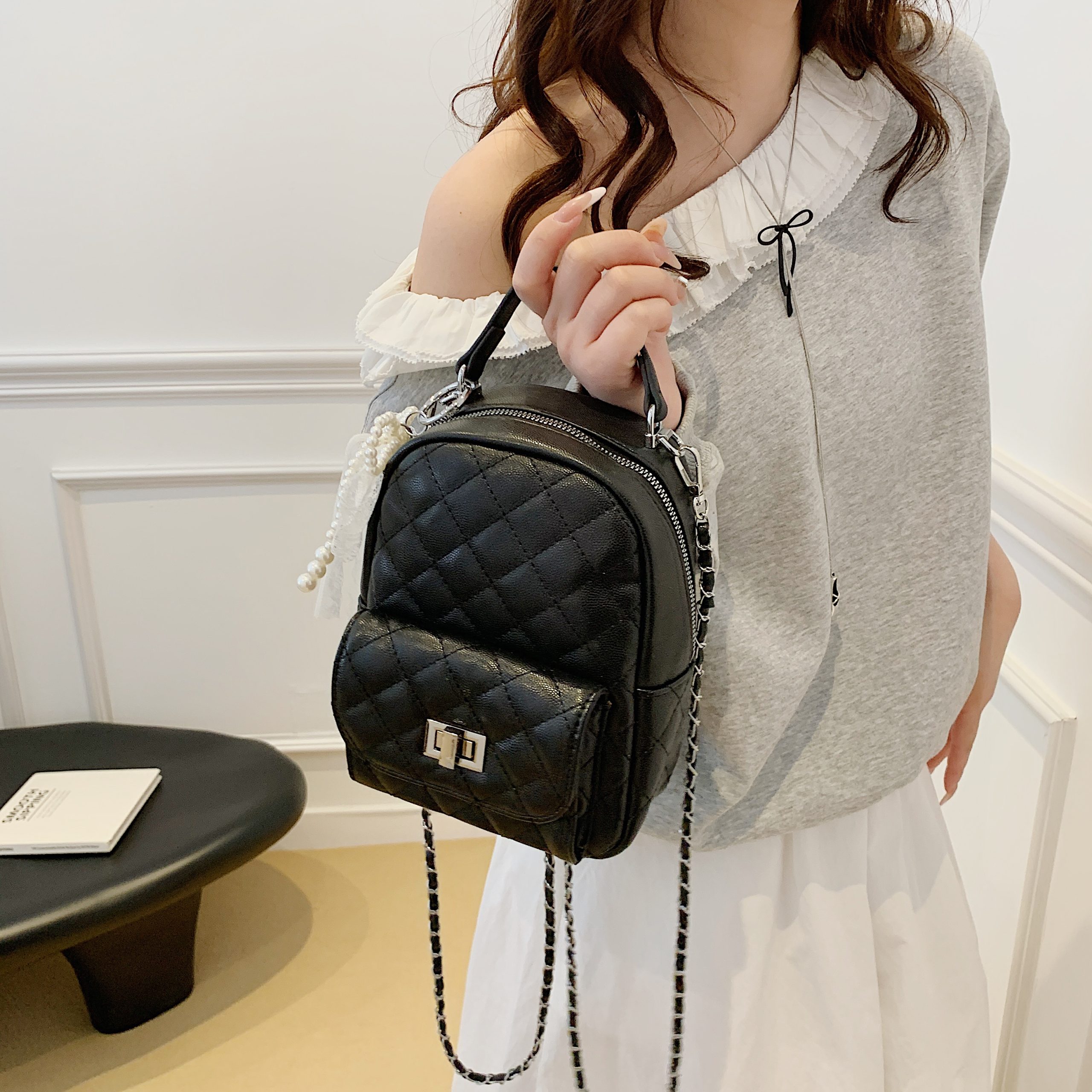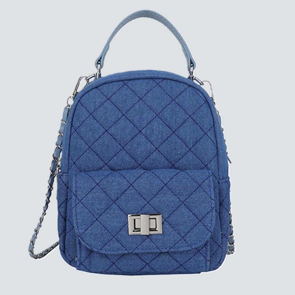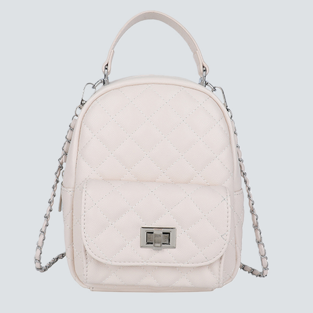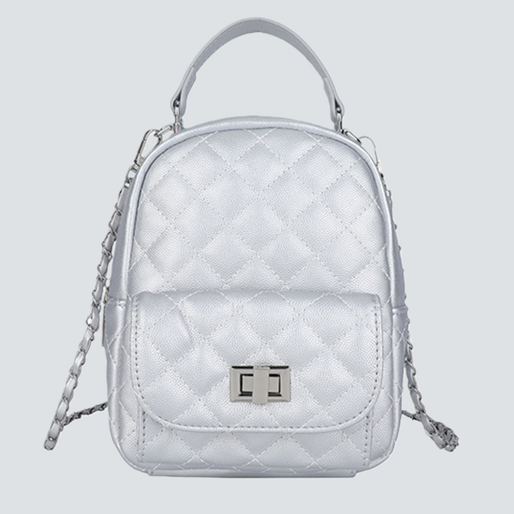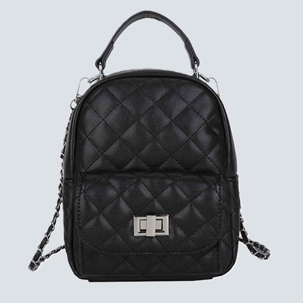 Redefine compact luxury with this exquisitely crafted mini backpack. The iconic diamond quilted texture lends a timeless elegance, while the polished chain strap and subtle lace trims add layers of refined charm — a nod to understated opulence.Designed for versatile styling: dual top handles enable backpack wear, while the adjustable chain strap transforms it into a crossbody or shoulder bag. The compact silhouette houses daily essentials, making it a sophisticated companion for both casual outings and elevated occasions. It’s a piece that speaks to those who value curated detail and functional glamour.