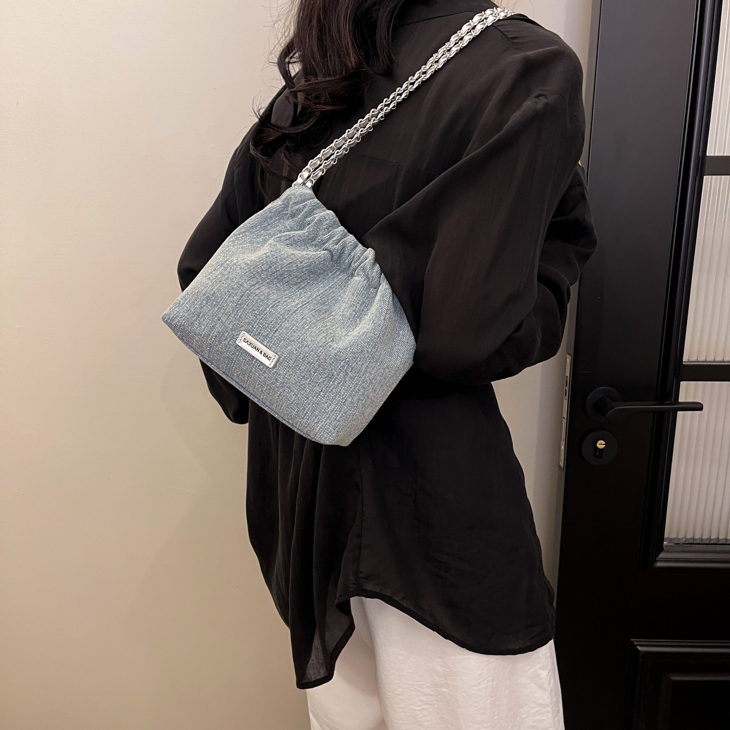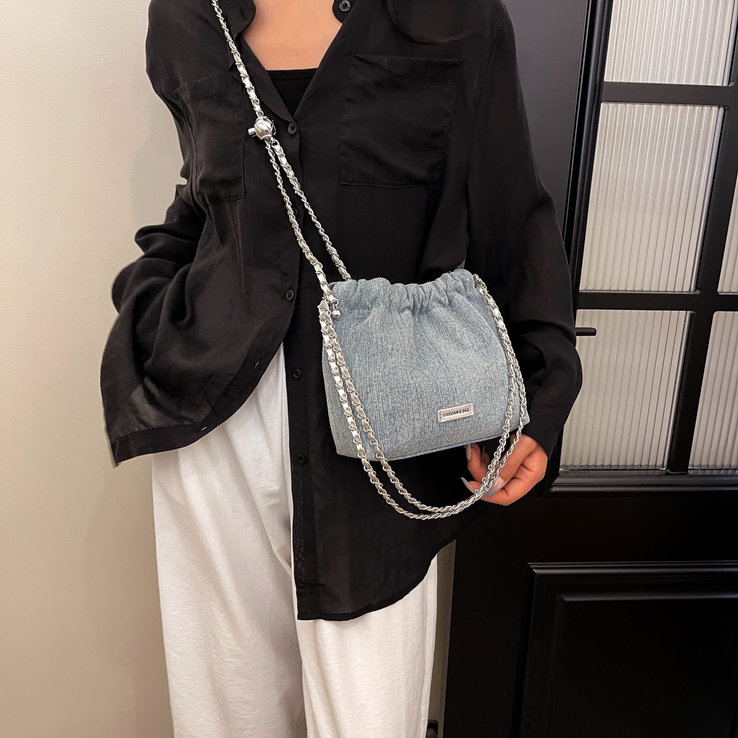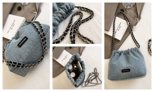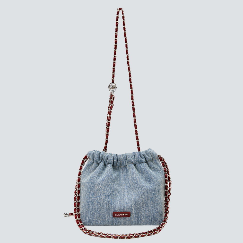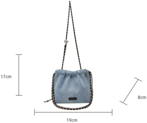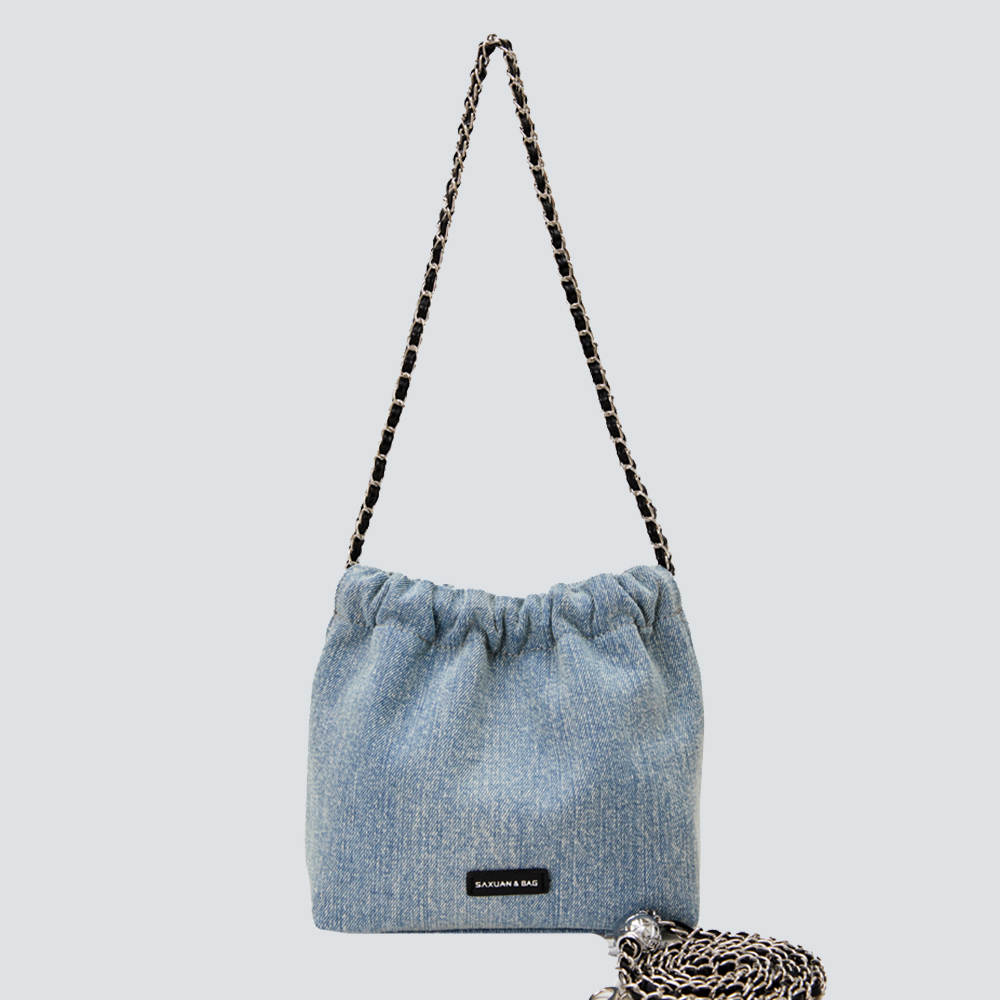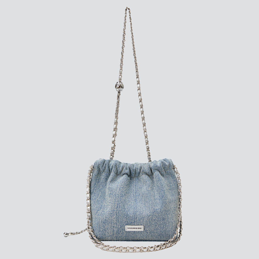 This bucket bag redefines casual sophistication through textured contrast: its soft denim fabric lends a laid-back, lived-in charm, while the bold chain straps (in rich color-matched finishes) add an edgy, polished touch. The drawstring closure balances ease of use with a slouchy, relaxed silhouette—offering ample space for daily essentials (phone, wallet, cosmetics) without sacrificing its effortless shape. The adjustable chain straps ensure customizable wear: carry it as a shoulder bag for understated chic, or lengthen for a crossbody fit that suits busy days. Available in versatile light denim, this piece is a celebration of “effortless edge”: a staple that merges casual comfort with intentional detail, perfect for curating looks that feel both relaxed and uniquely stylish.
