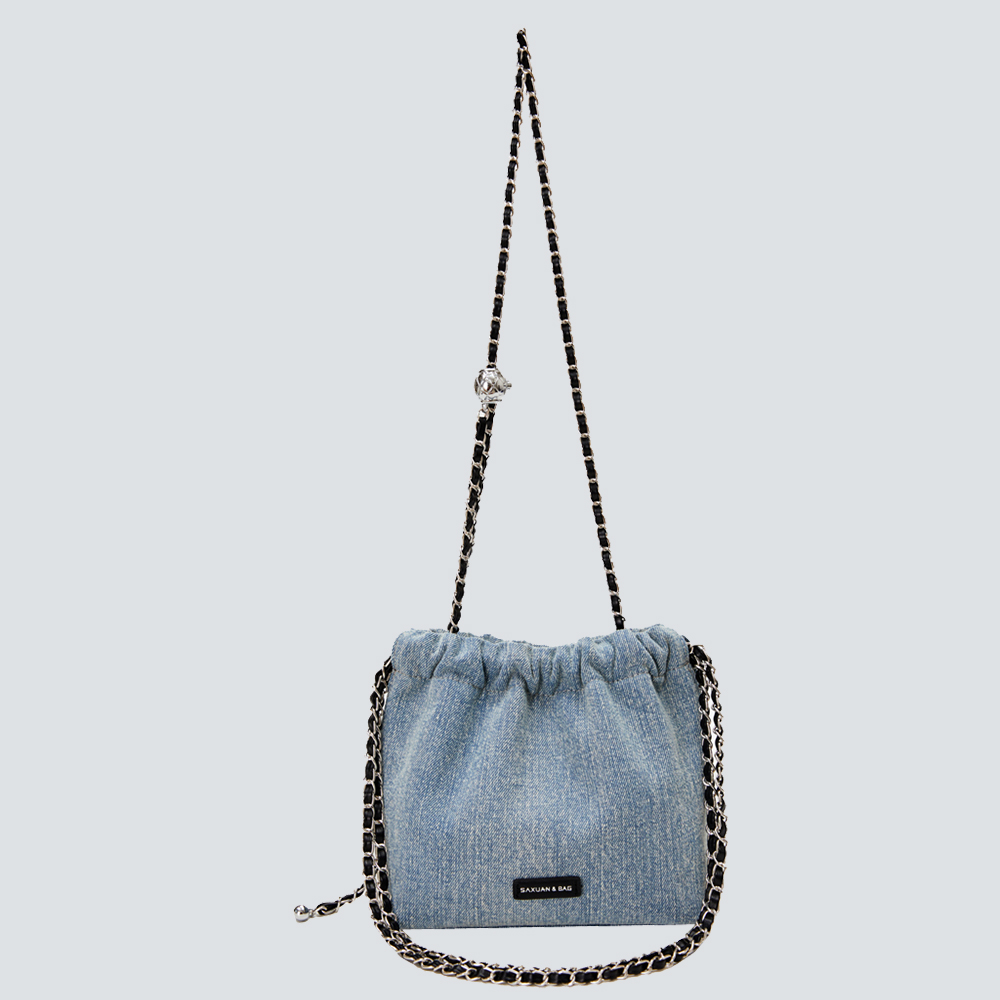 A relaxed denim bucket bag featuring a drawstring closure and statement contrast chain straps. Merges casual charm with edgy details for effortlessly stylish daily looks.#7556
