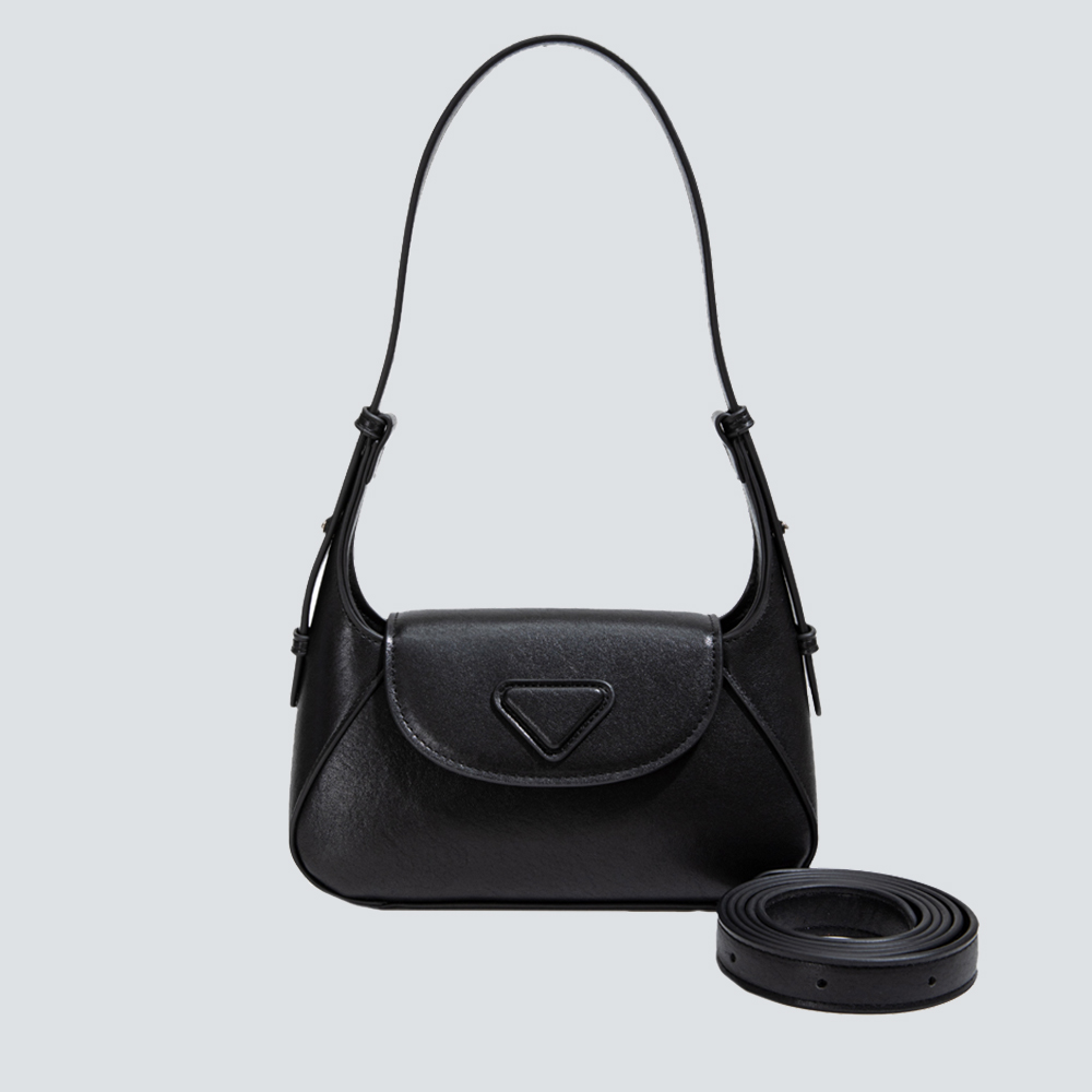 Embrace the elegance of “less is more” with this meticulously crafted shoulder bag. The smooth leather texture lends a tactile, timeless richness, while the minimalist triangle detail adds a quiet focal point — a nod to intentional, refined design.Designed for functional sophistication: the adjustable strap transforms it from a sleek shoulder bag to a relaxed crossbody, while the compact structured interior secures daily essentials. Available in deep, muted hues, it complements wardrobes that value clean silhouettes, quality materials, and understated distinction.