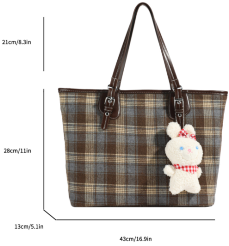 A blend of classic plaid fabric, smooth leather accents, and a playful bunny charm—this tote balances retro elegance with gentle personality, elevating any outfit.#5607