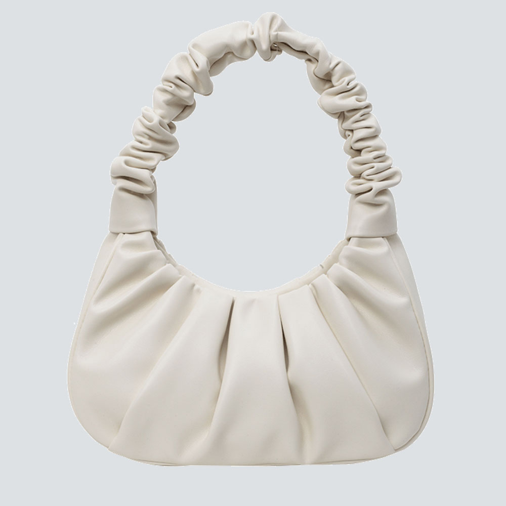 This mini bag redefines subtle luxury through tactile design: the gathered leather creates a soft, dynamic texture, while the ruched top handle adds a playful yet polished detail—striking a balance between whimsical charm and refined minimalism.