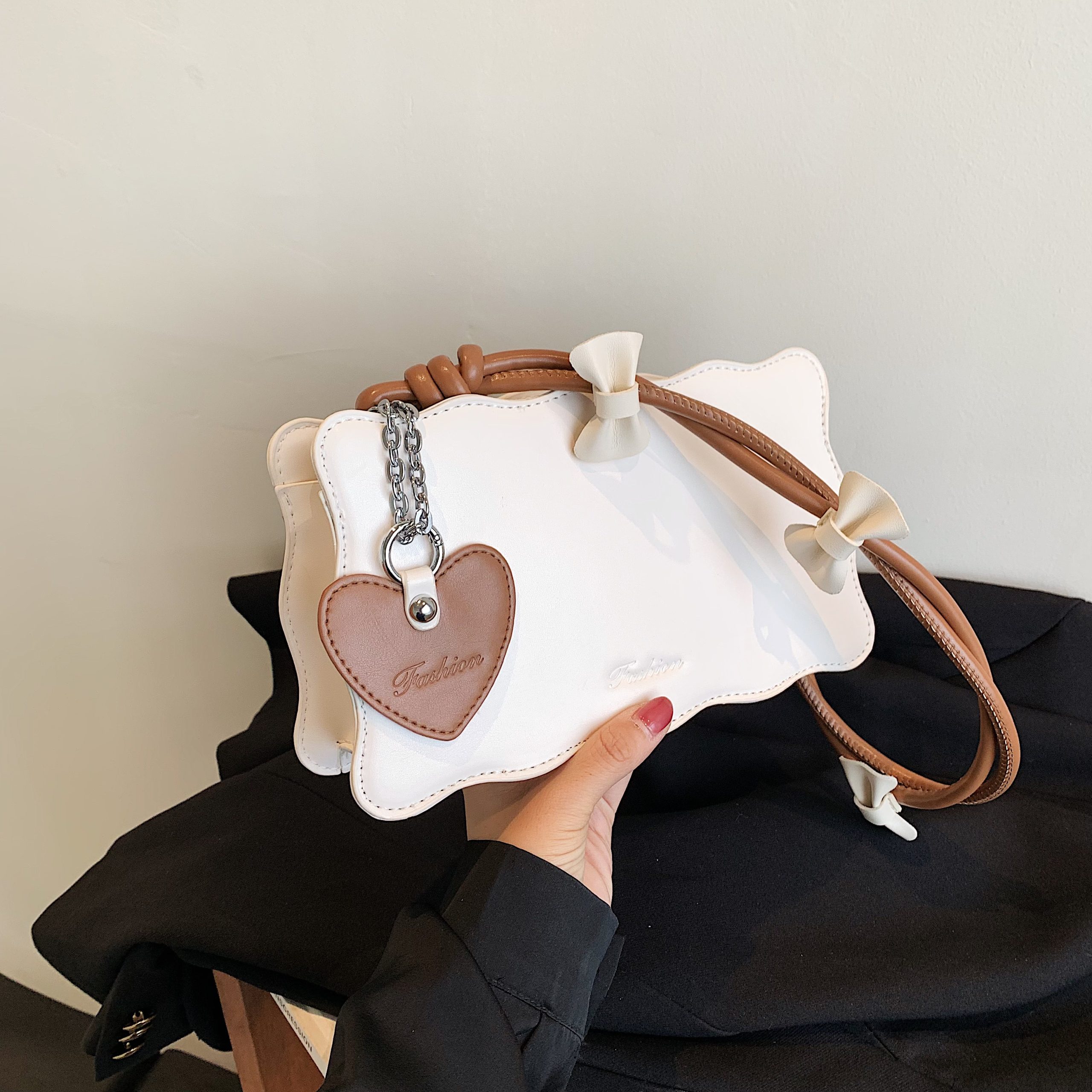 Elevate your accessory edit with this whimsical mini bag: smooth leather fabric, scalloped edges, and delicate bow details—blending playful charm with refined sophistication.#85190