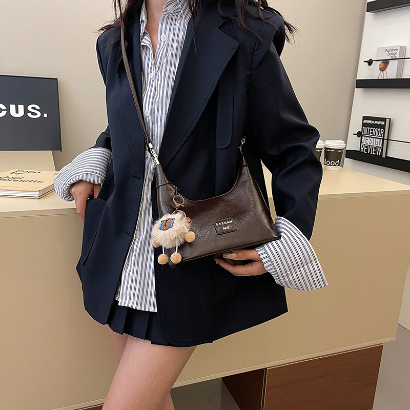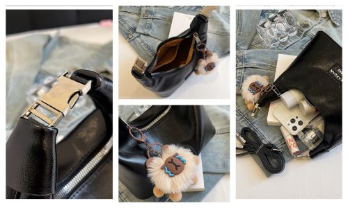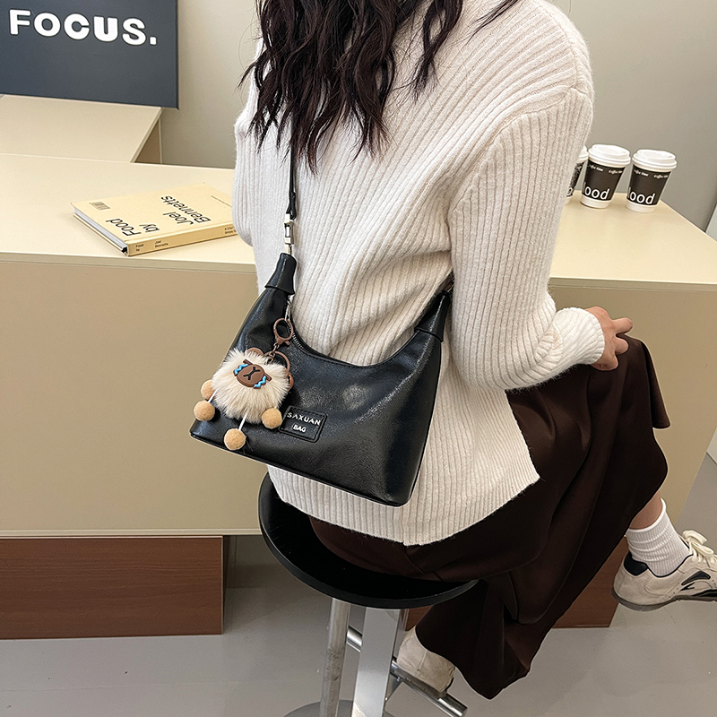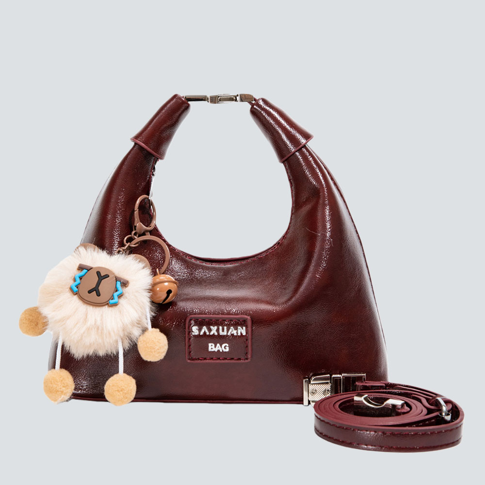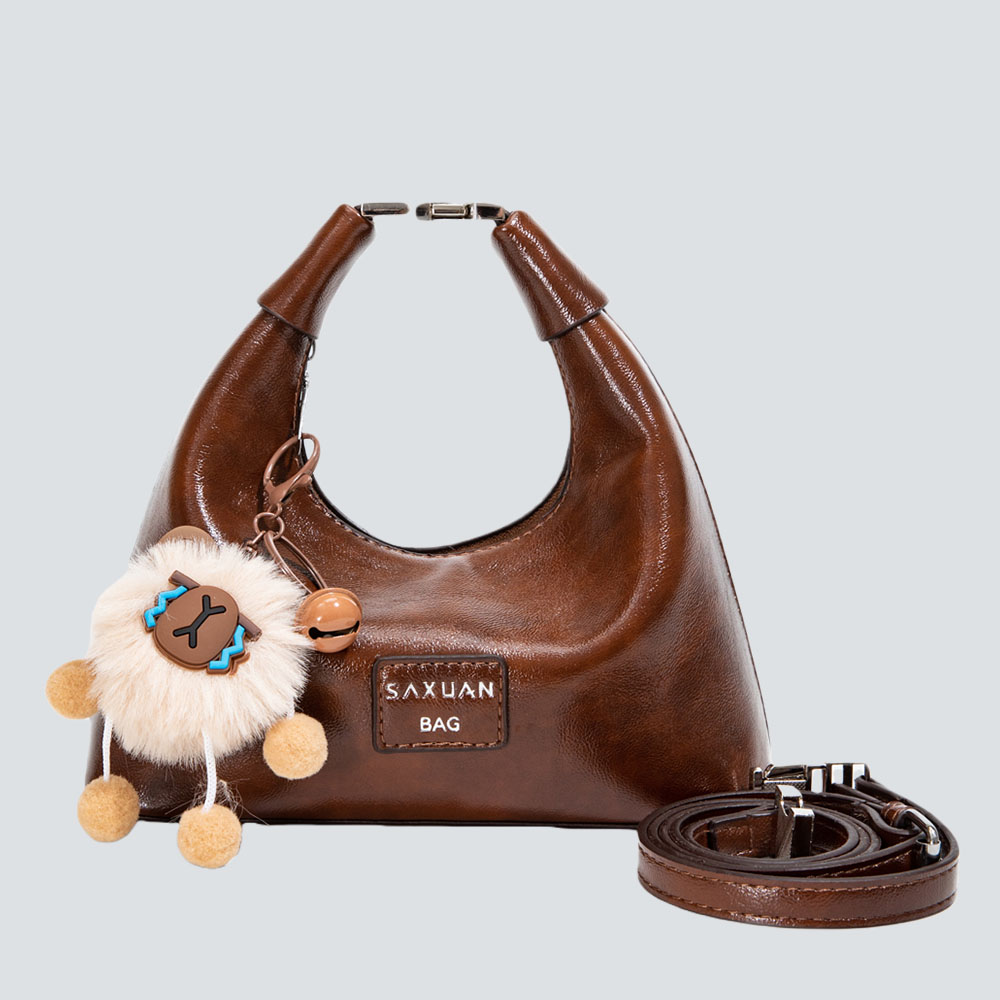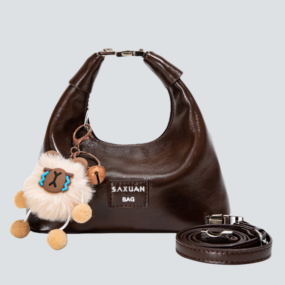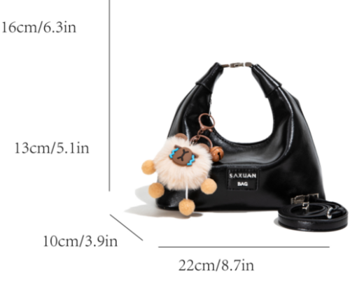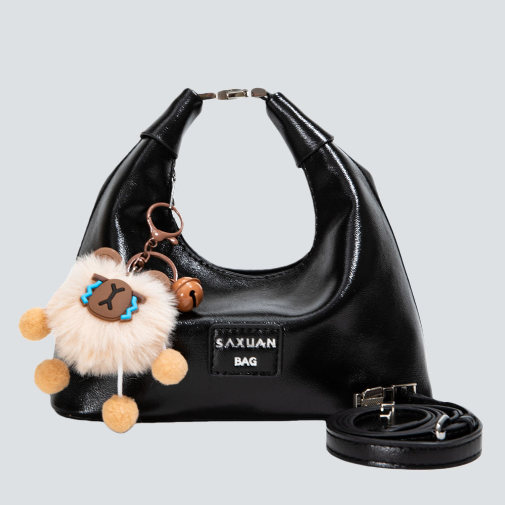 This half-moon bag redefines quiet sophistication through intentional contrast: the smooth, polished leather wraps the sleek silhouette in understated luxury, while the detachable fluffy charm adds a soft, whimsical twist—striking a balance between refined minimalism and gentle personality.