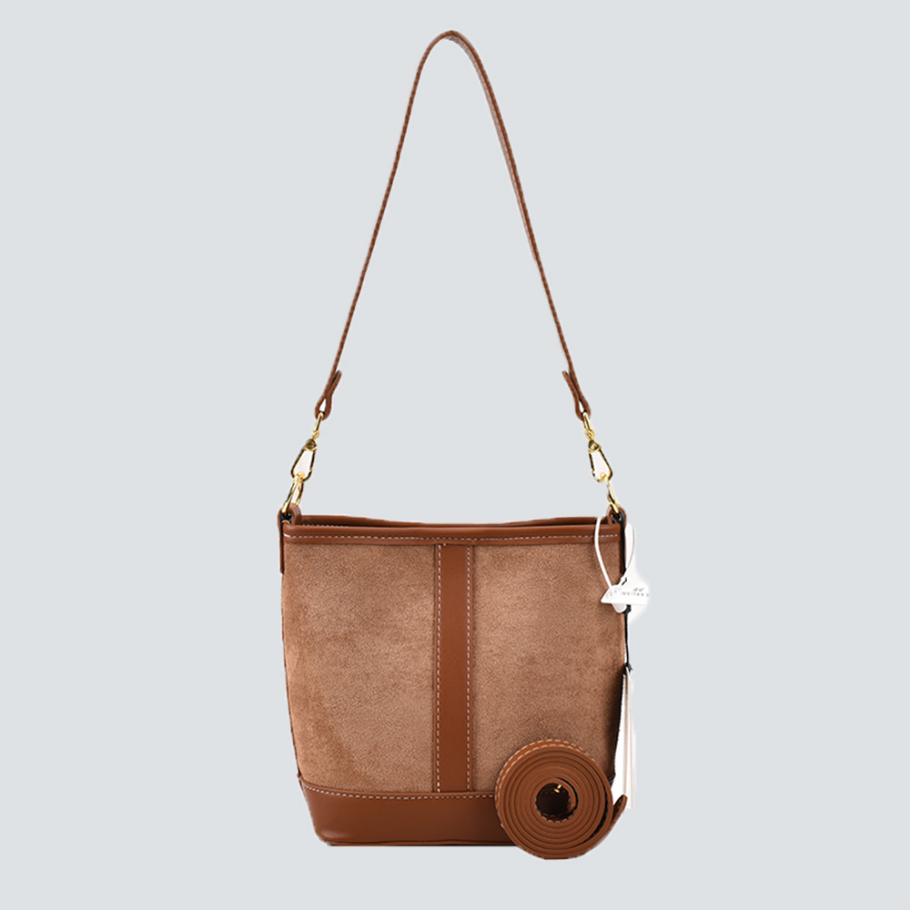 Crafted with intentional texture contrast, this crossbody bucket bag marries the plush softness of suede with the polished sleekness of premium leather, creating a visually layered, tactile silhouette. The muted tonal palette exudes quiet sophistication, while gold-toned hardware adds subtle luminous detail that elevates its understated design. Its adjustable strap offers customized wear—from snug crossbody to relaxed shoulder carry—adapting seamlessly to your daily rhythm. Compact yet thoughtfully sized, it holds essentials with grace, making it a seamless companion for coffee runs, errands, or leisurely outings. More than an accessory, it’s a curated statement: where timeless texture meets effortless versatility, for the discerning wearer.