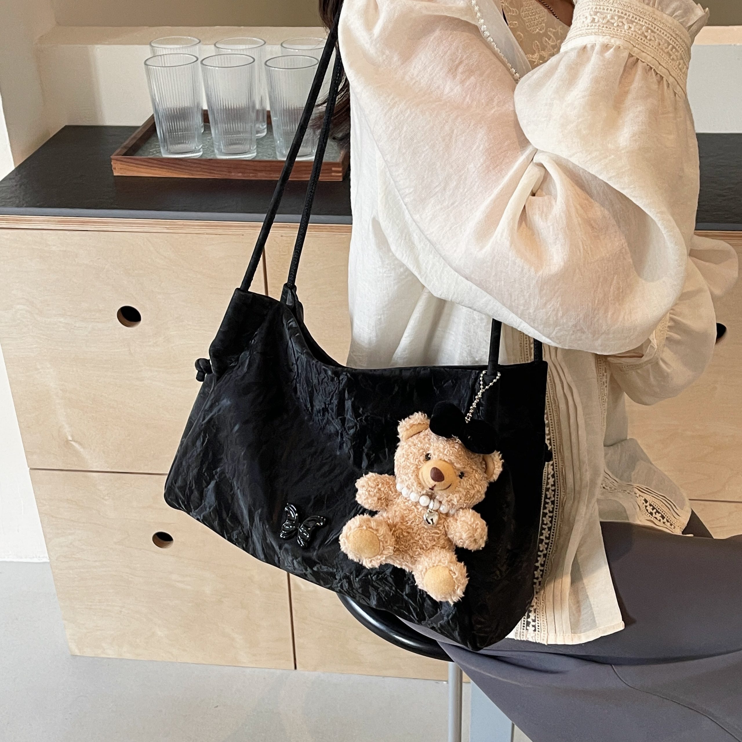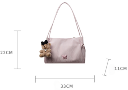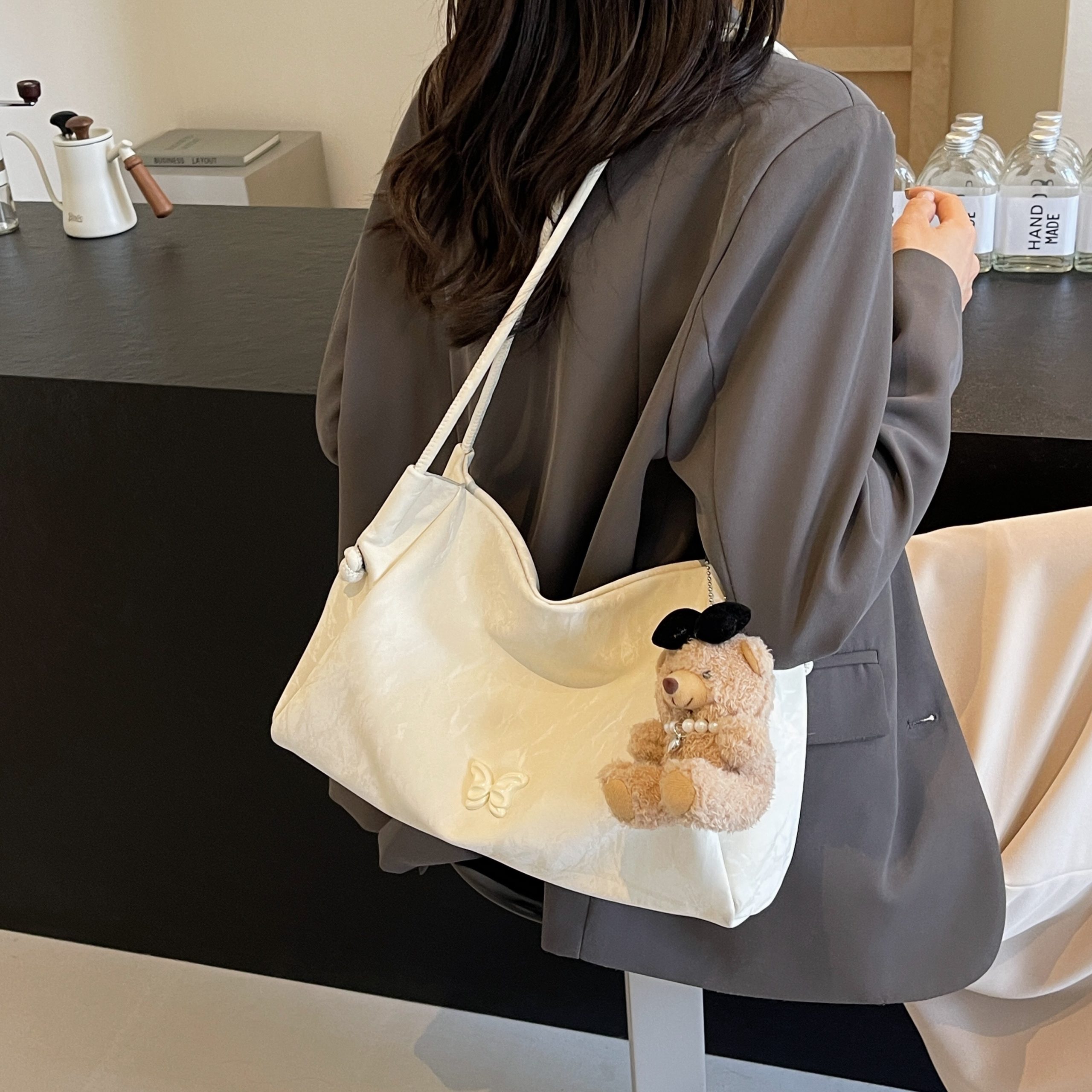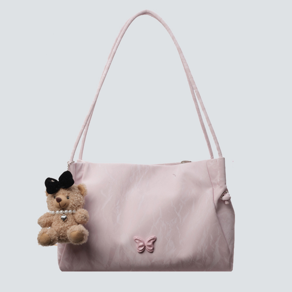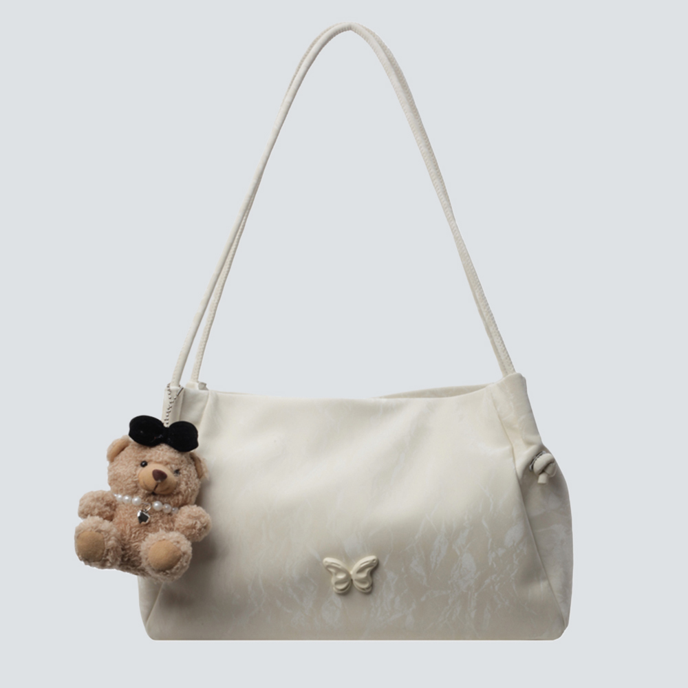 Crafted from sumptuous textured fabric, this tote bag embodies soft sophistication through its flowing silhouette and delicate details. The subtle embossed butterfly motif adds a romantic, whimsical touch, while the plush pearl-teddy charm infuses playful personality into its refined design. Its spacious interior accommodates daily essentials with ease, and the adjustable strap offers versatile carry—handheld for polished outings, crossbody for casual convenience. The muted pastel palette exudes timeless charm, making it a seamless complement to both feminine and modern ensembles. More than an accessory, it’s a curated statement: where soft texture meets delightful character, for the discerning wearer.