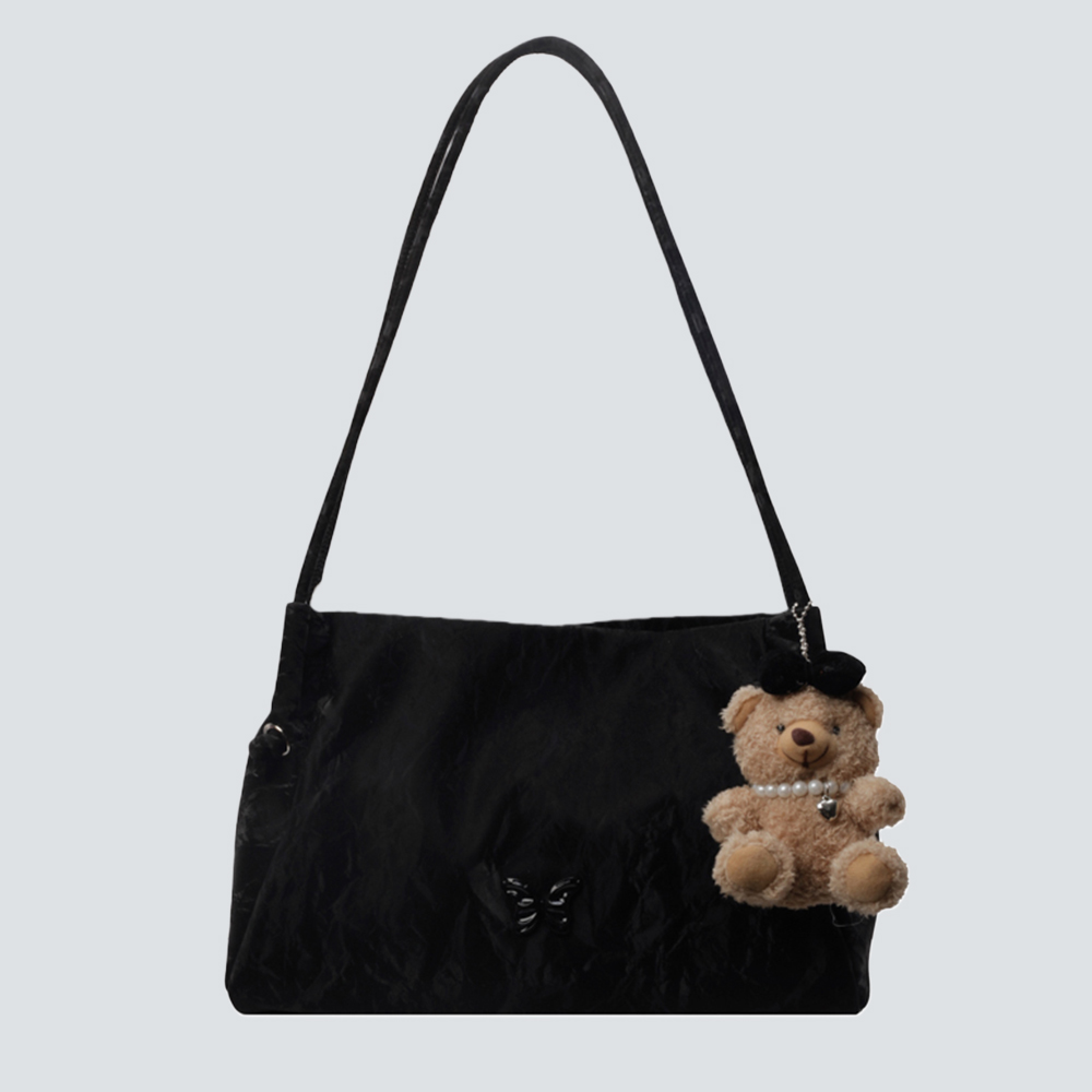Luxe textured fabric paired with a playful pearl-teddy charm—this bag balances soft romanticism with understated refinement, elevating everyday and occasion looks.#5593
