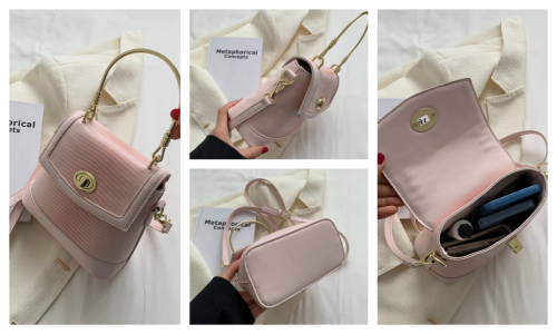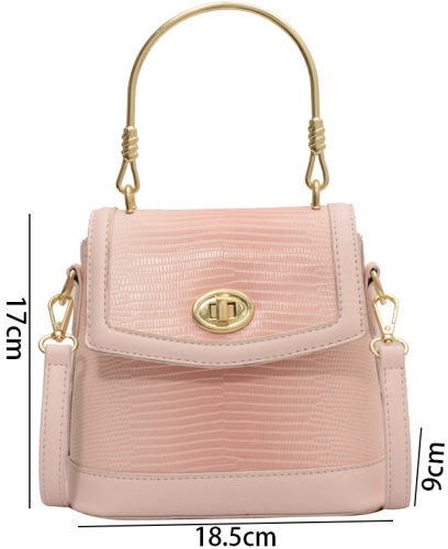 A compact bucket bag crafted from embossed leather, featuring a sleek gold hoop handle and adjustable strap. Soft pastel hues meet refined details for understated daily luxury.#6037