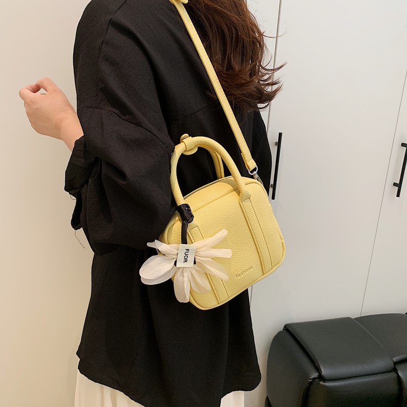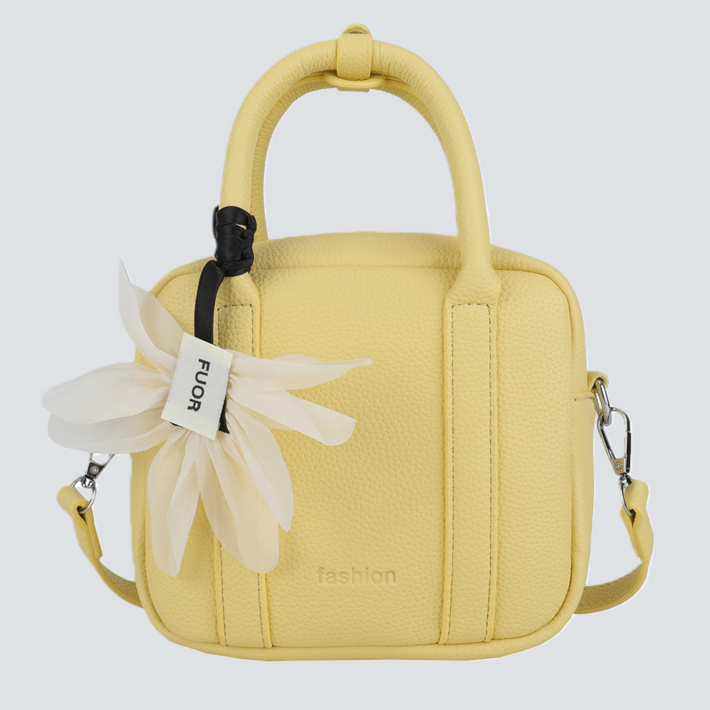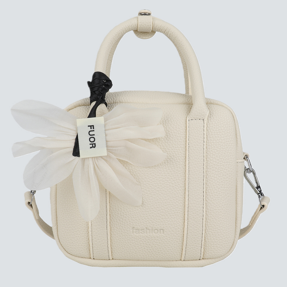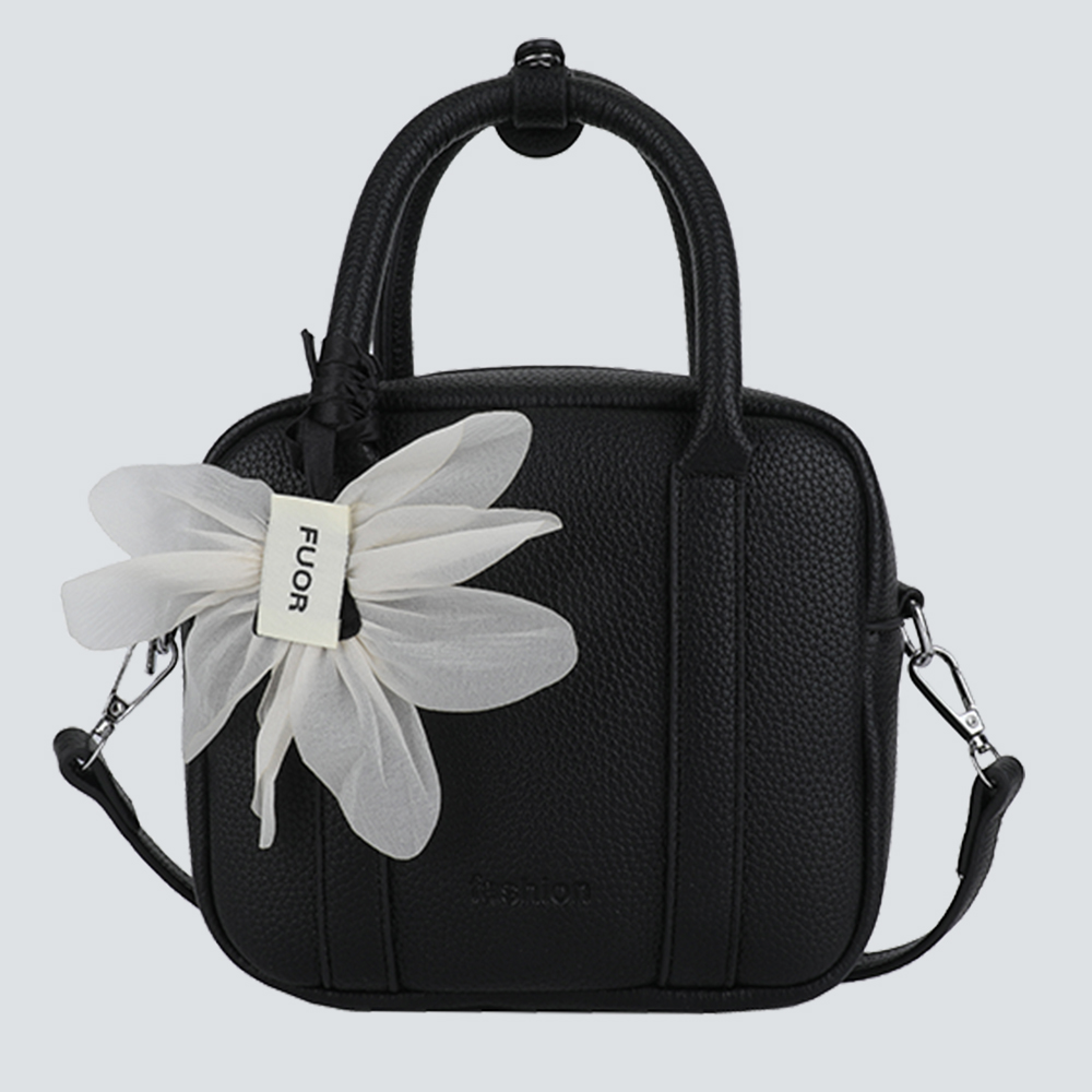 A compact top-handle bag crafted from premium textured leather, elevated by a delicate organza flower detail. Versatile (handheld or crossbody) and effortlessly chic for daily elegance.#5619