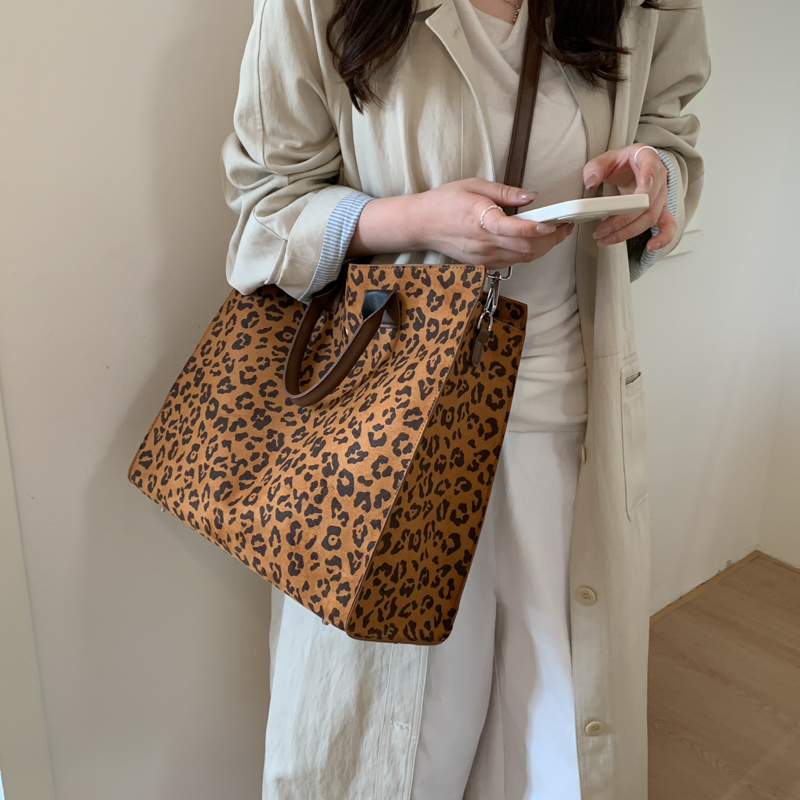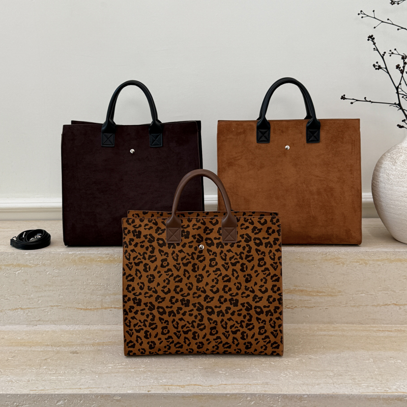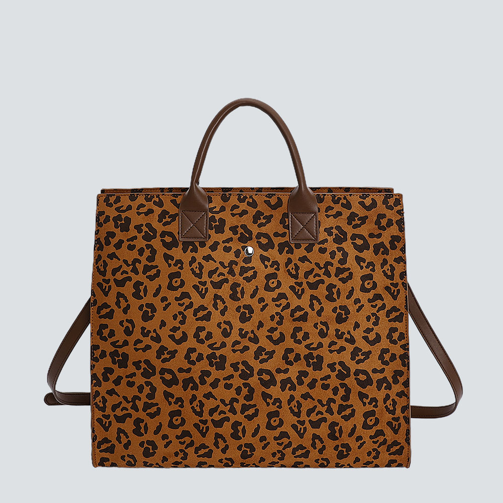 Elevate daily essentials with this refined tote: plush suede/leopard fabric, structured silhouette, and polished contrast hardware—blending tactile luxury with versatile functionality.#6615