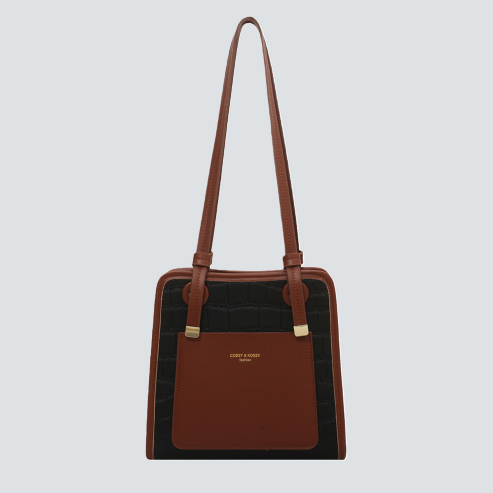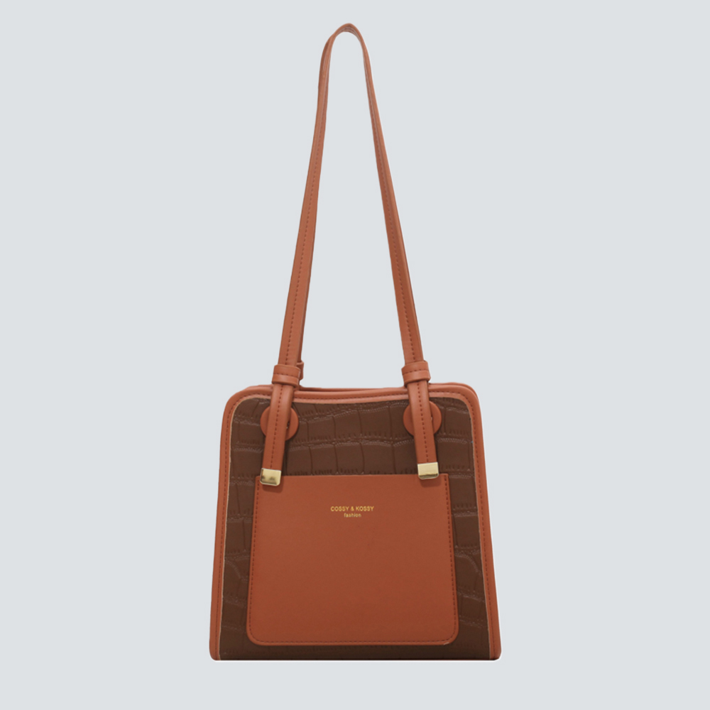 A structured satchel crafted from croc-embossed leather, featuring elegant two-tone panels and polished gold hardware. Merges timeless texture with modern design for versatile daily elegance.#7681
