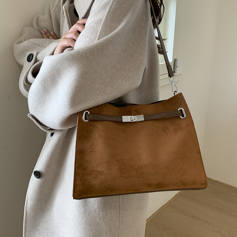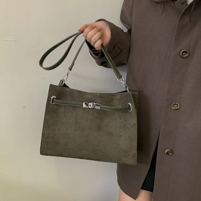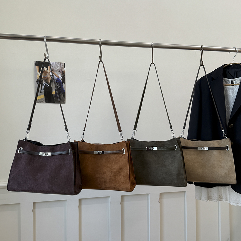 Crafted from soft suede, the matte texture exudes a relaxed vintage vibe. The minimalist tote silhouette softens sharp edges, with gentle lines complementing diverse figures and outfits.The sleek metal buckle serves as a visual highlight while reinforcing the closure; the softened wide leather strap ensures comfort for shoulder carrying, or adds elegance when handheld.Low-saturation hues echo the suede texture. From work commutes to casual outings, it’s both a practical carrier for daily needs and a luxury statement that elevates styling sophistication.