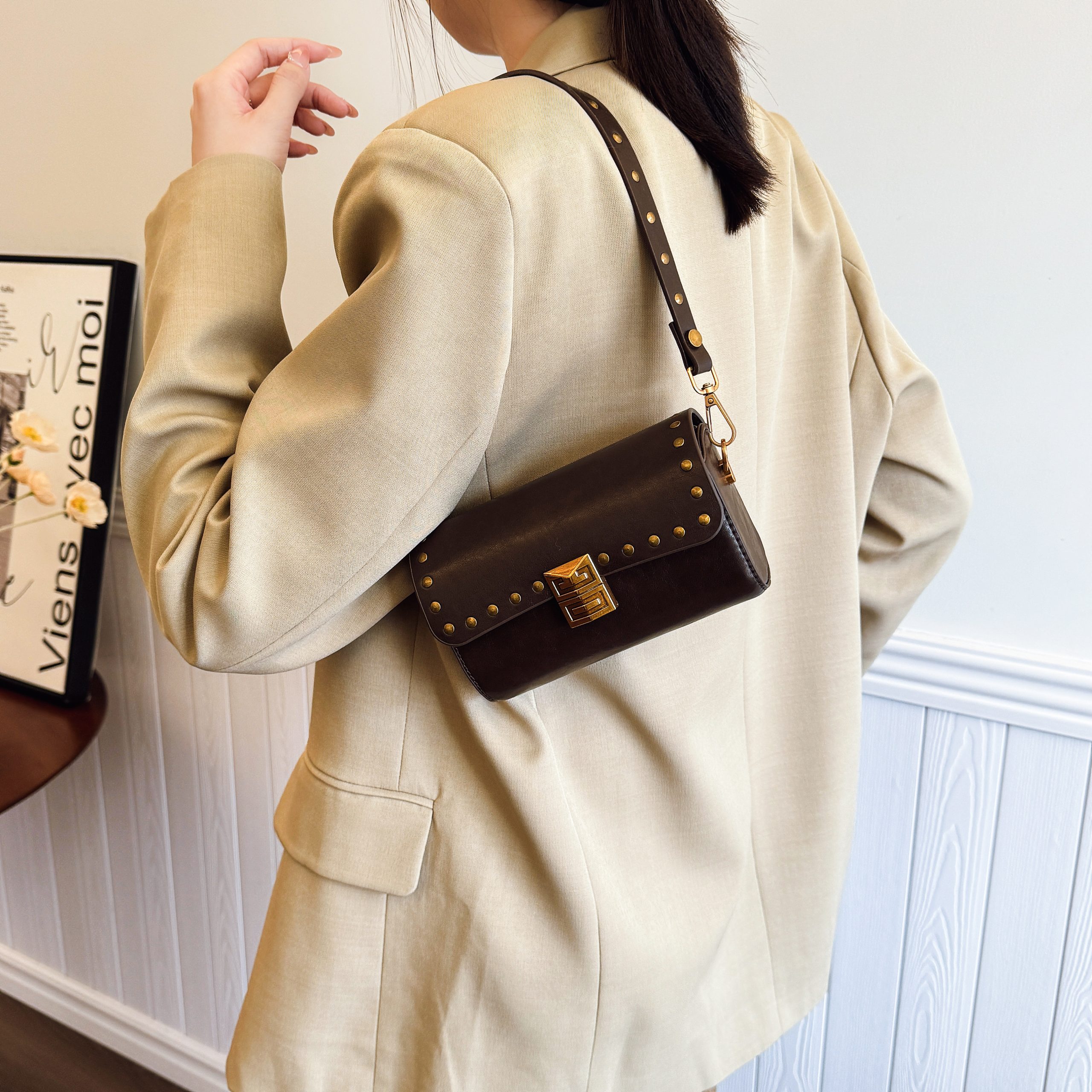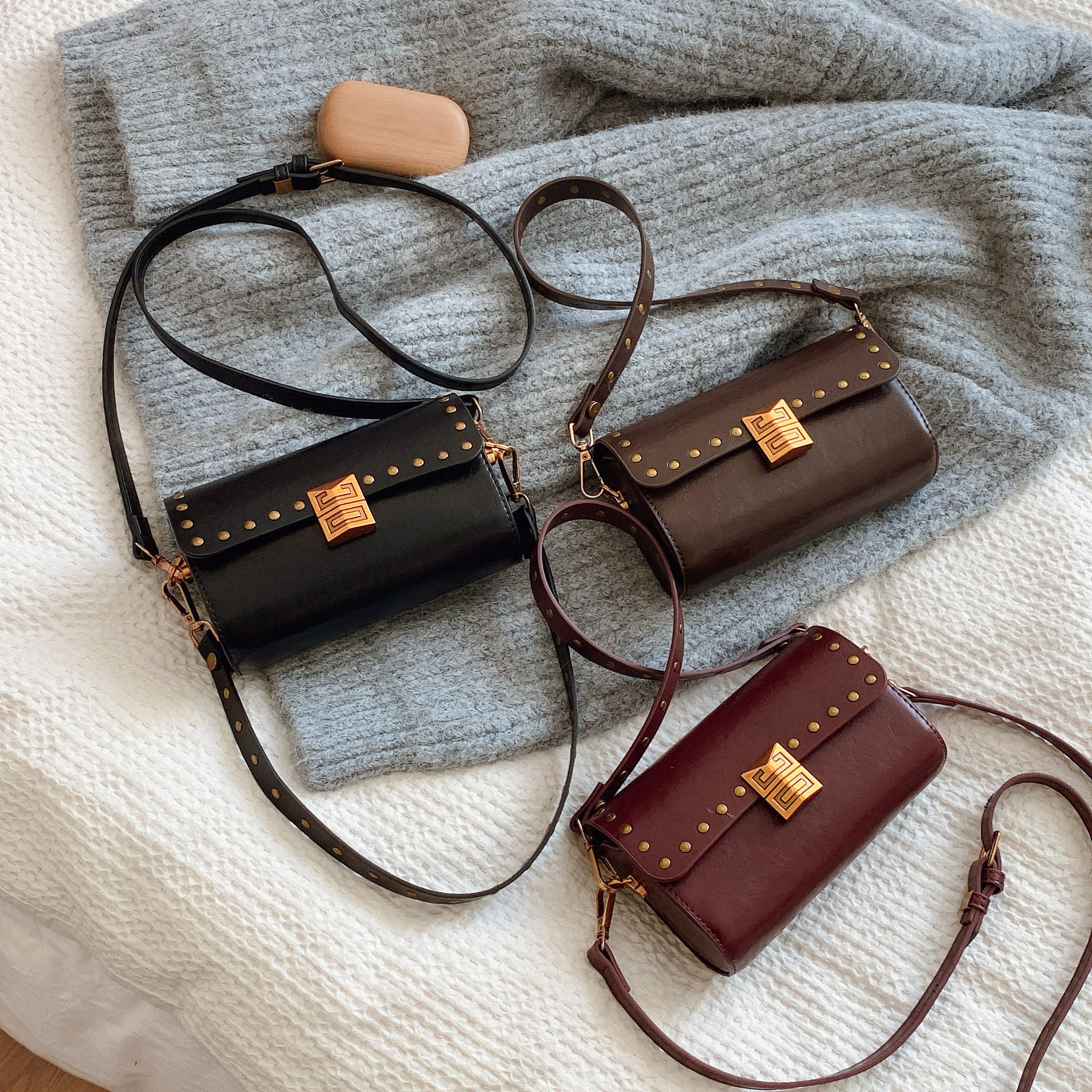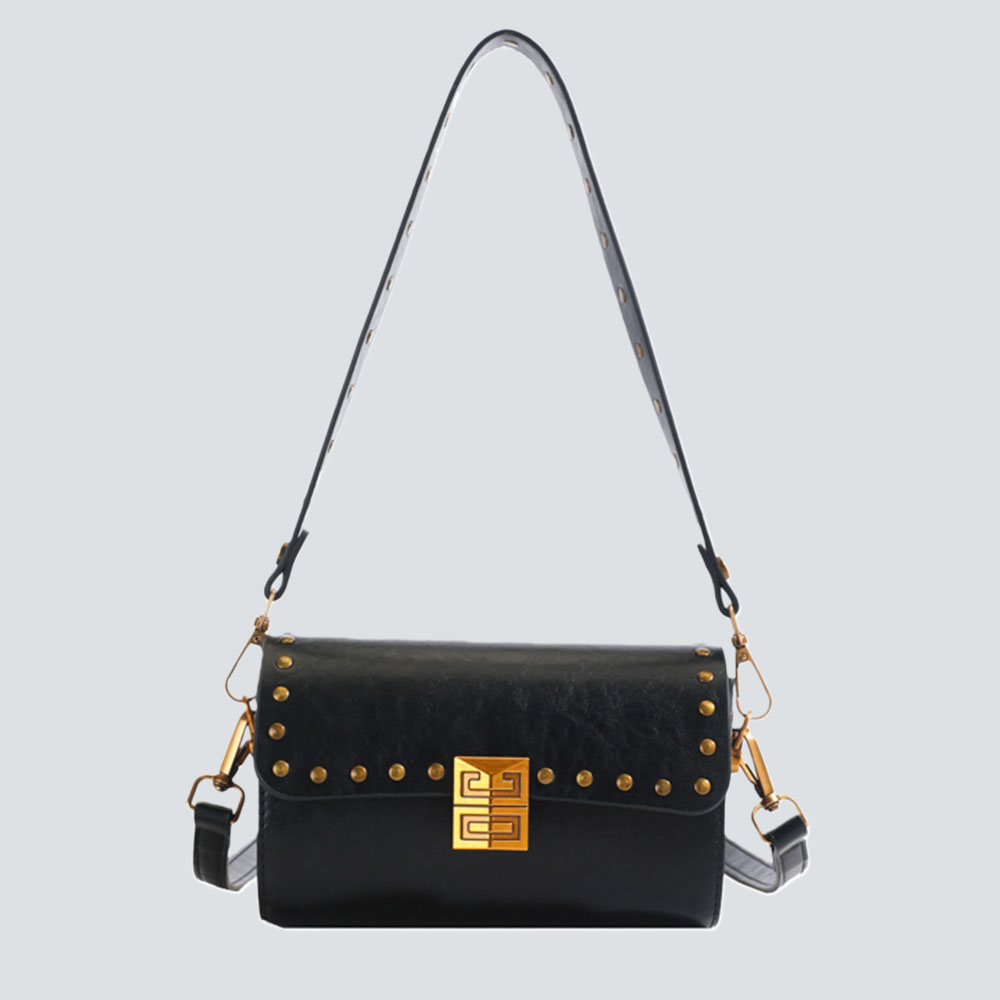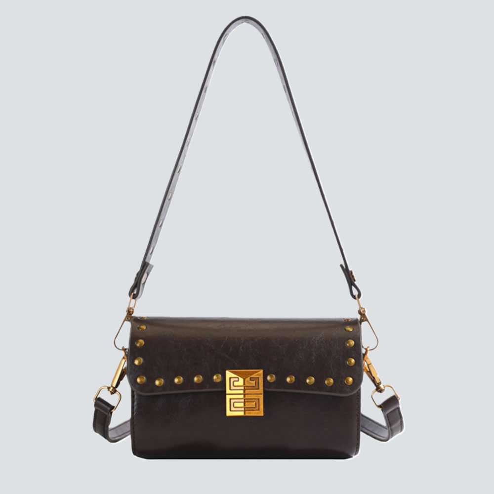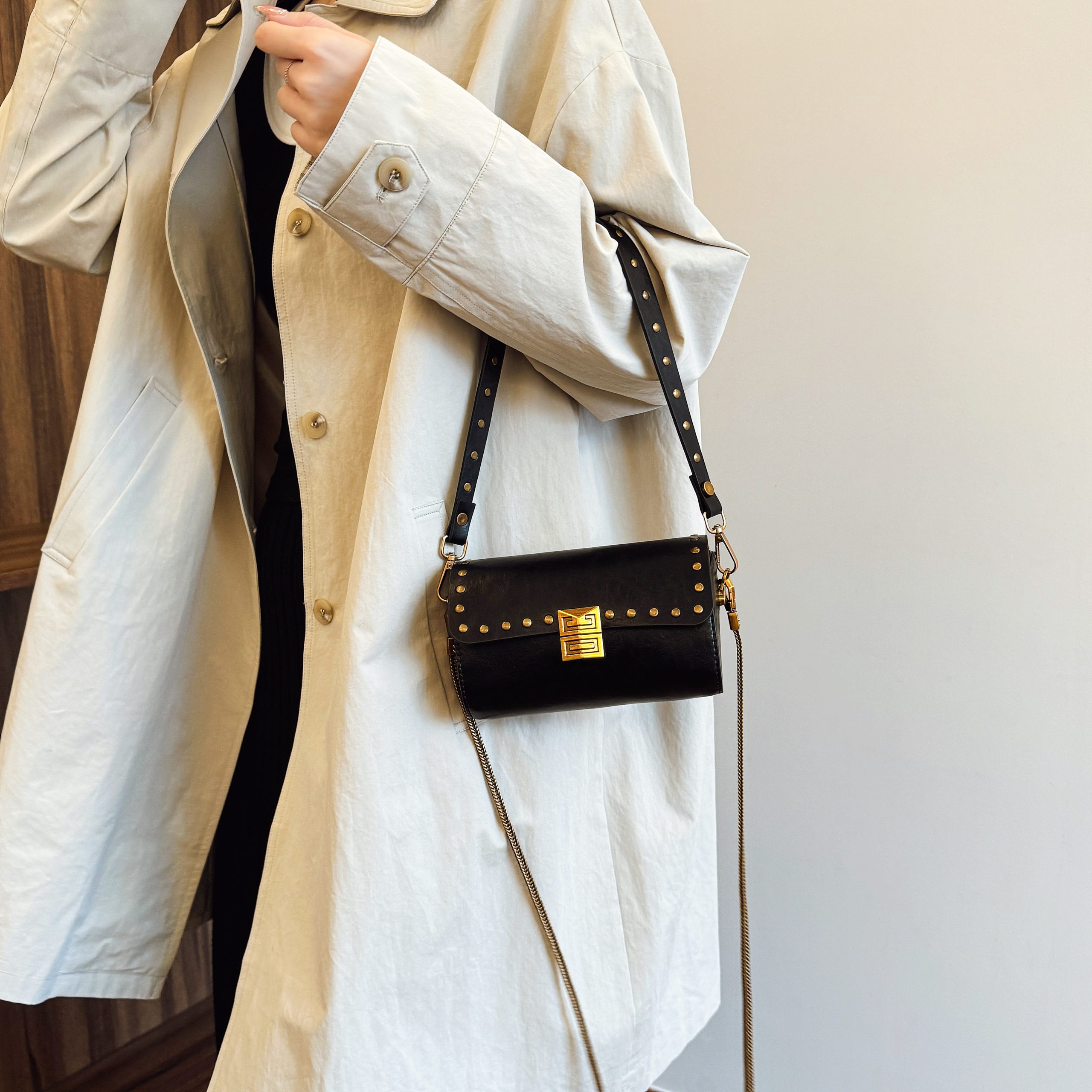 This crossbody bag reimagines retro sophistication through thoughtful craftsmanship. Made from supple, smooth leather, its slim silhouette is elevated by polished stud accents that add subtle texture without overstatement—while the bold gold-tone clasp serves as a striking focal point, merging vintage flair with modern refinement.