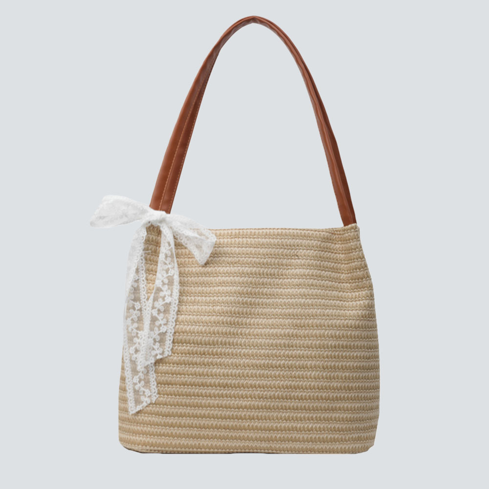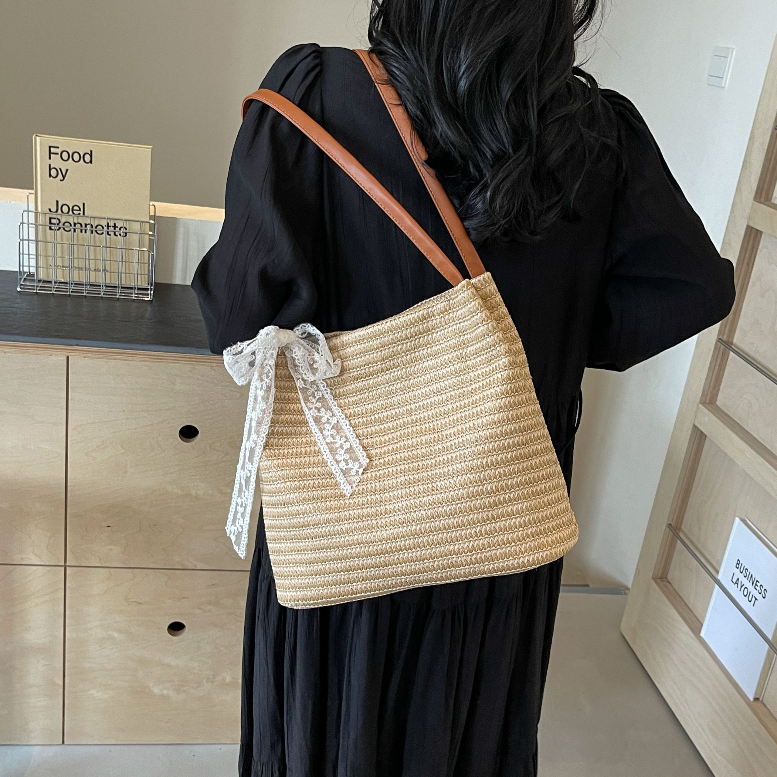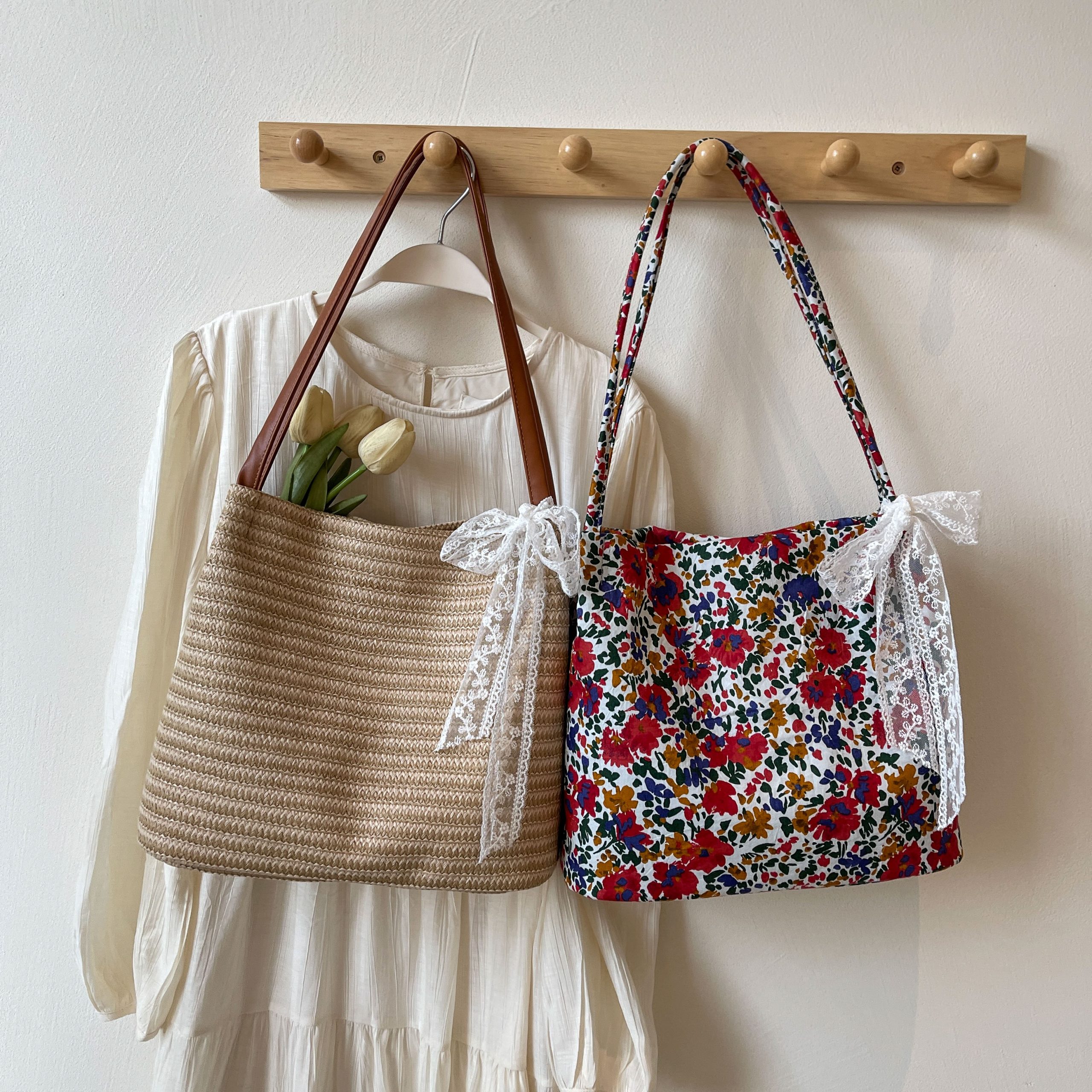 Crafted from natural woven texture or vintage floral fabric, each detail carries a relaxed French vibe. The minimalist tote silhouette softens bulk, with gentle lines complementing diverse figures and outfits.The delicate lace bow redefines soft elegance—both a decorative highlight and a touch of aesthetic ingenuity; the softened wide strap ensures pressure-free shoulder carrying, with spacious capacity for daily essentials.Natural hues echo the textured finish. From commutes to casual outdoor outings, it’s both a practical carrier for daily needs and a romantic statement that elevates styling sophistication.