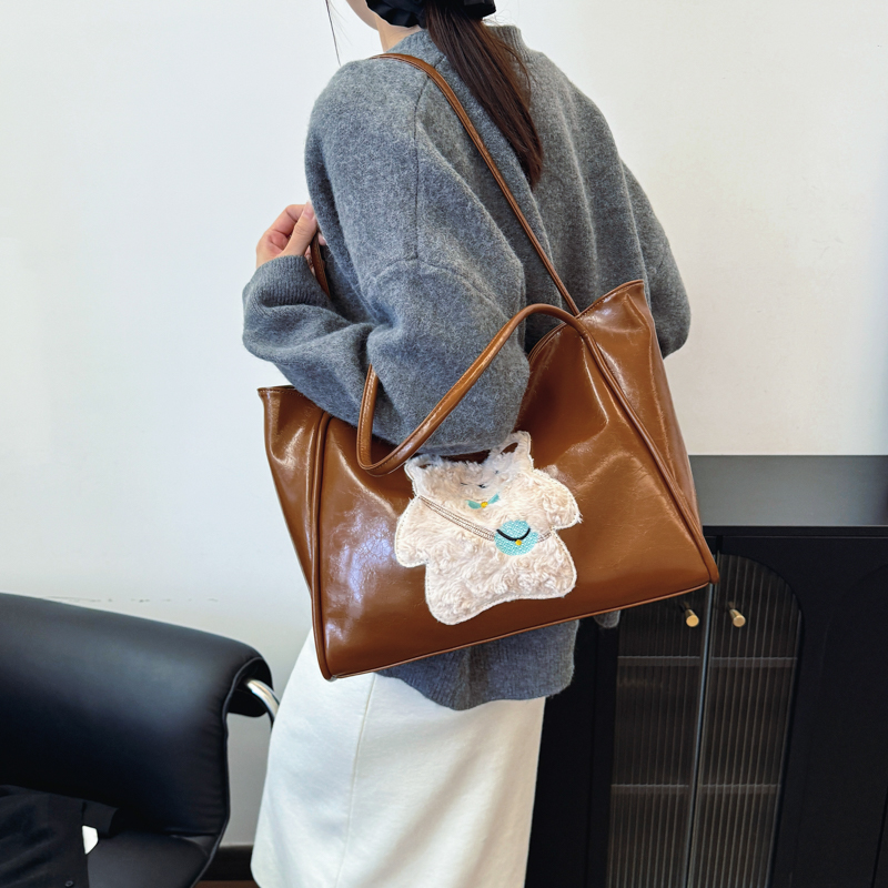 Glossy Leather Tote Bag with 3D Plush Embellishments
