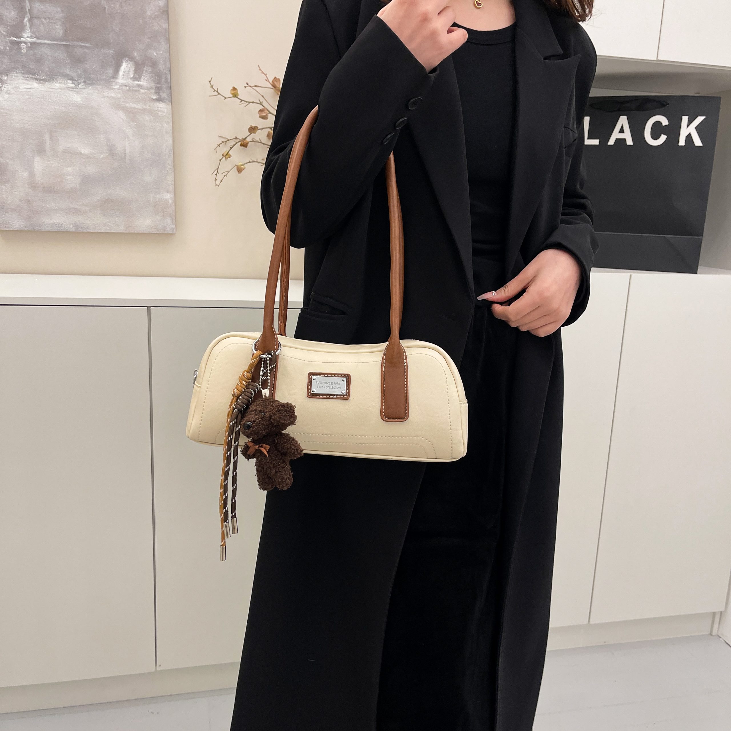 This top-handle bag balances refined minimalism with quiet personality: its smooth leather surface lends a luxe, tactile finish, while the compact structured silhouette ensures sleekness without sacrificing practicality. The detachable plush teddy charm—paired with delicate tassel accents—adds a whimsical, personalized touch, elevating the design beyond basic accessories. The slender top handles offer elegant handheld styling, while the streamlined shape accommodates daily essentials (phone, cardholder, keys) for seamless transitions between workdays and weekends. Available in versatile neutral tones, this bag is a staple of “effortless sophistication”: a piece that merges artisanal craft with subtle character, perfect for curating looks that feel both intentional and uniquely yours.