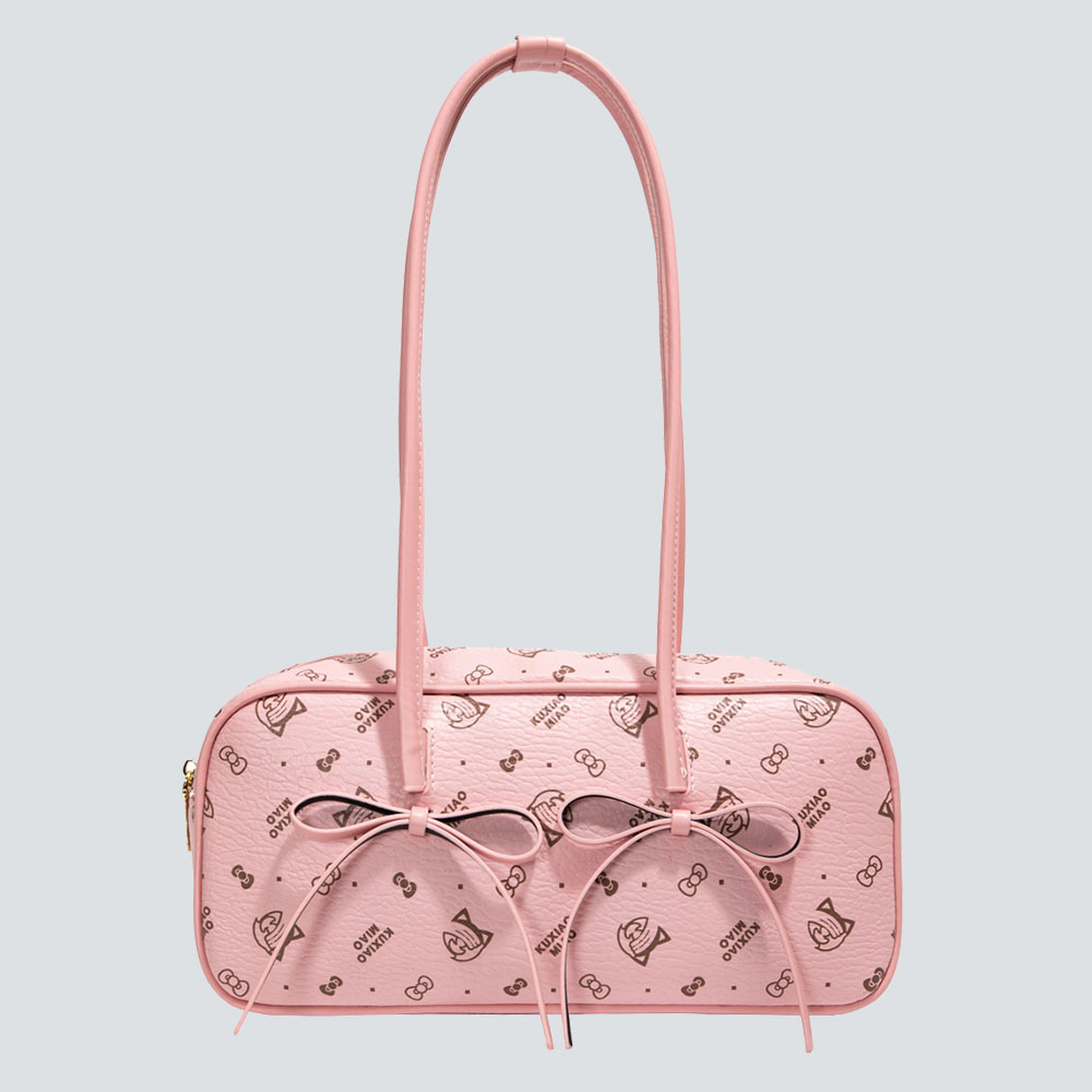 This mini shoulder bag redefines playful sophistication through intentional detail: the subtle monogrammed pattern adds a layer of timeless charm, while the delicate bow accents infuse soft, feminine character—all wrapped in a sleek, structured silhouette that feels both approachable and elevated.