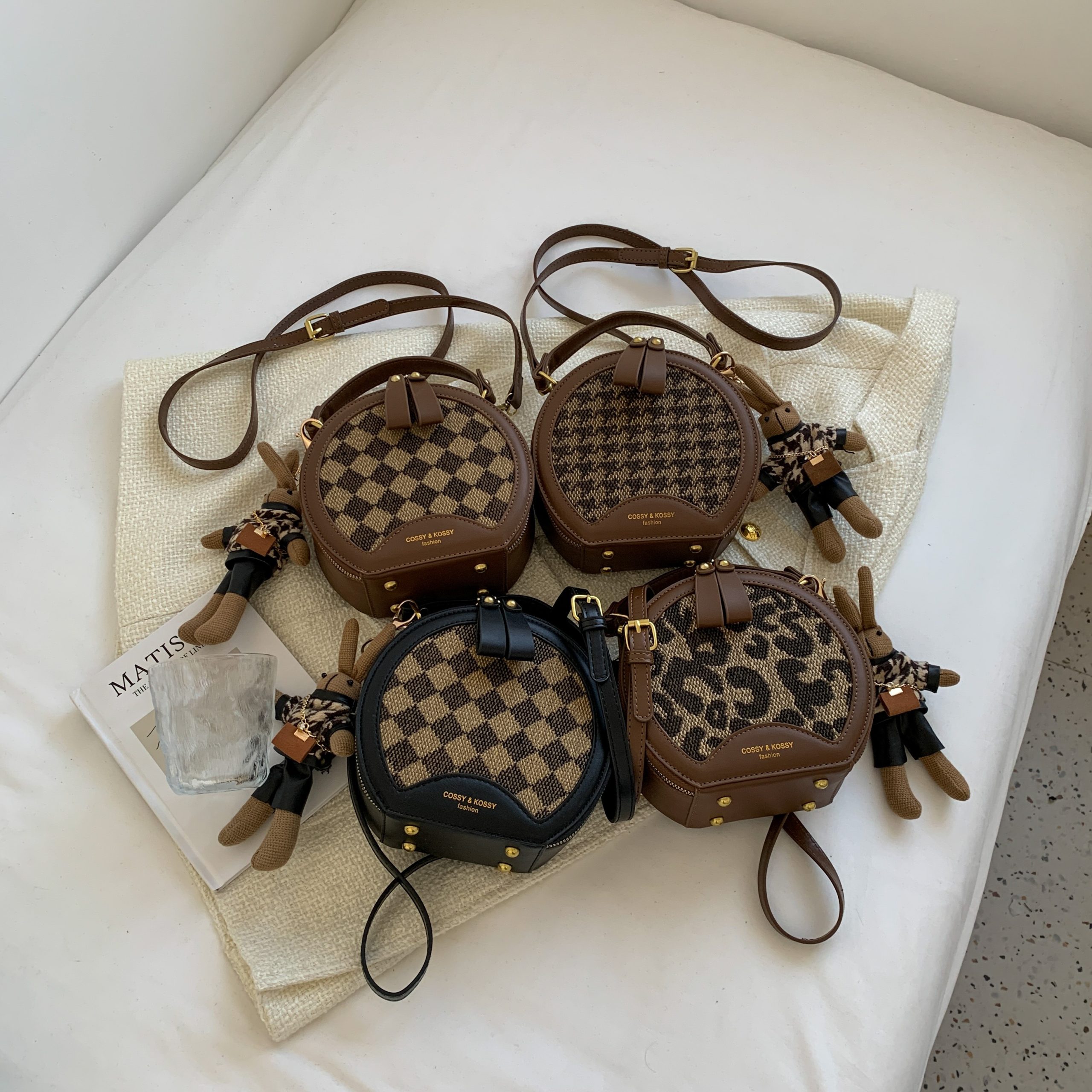 Elevate your style with this refined round bag: iconic check/houndstooth/leopard patterns, structured silhouette, and whimsical charm details—blending timeless design with playful sophistication.#7679