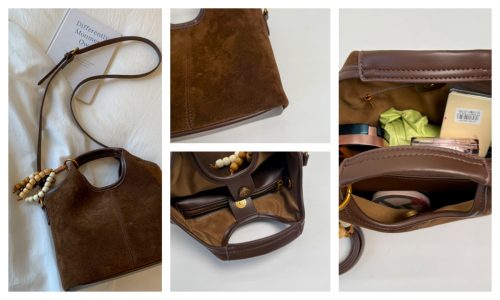 Elevate your accessory edit with this refined mini tote: plush suede fabric, structured silhouette, and handmade beaded charms—blending tactile luxury with artisanal charm.#1102