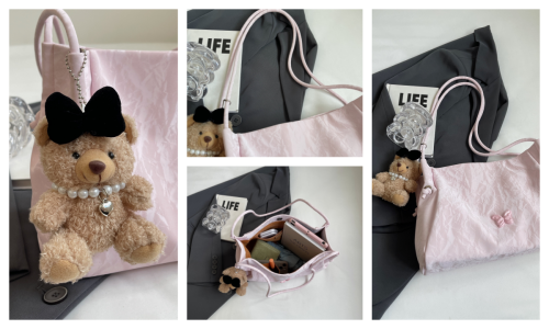 Luxe textured fabric paired with a playful pearl-teddy charm—this bag balances soft romanticism with understated refinement, elevating everyday and occasion looks.#5593