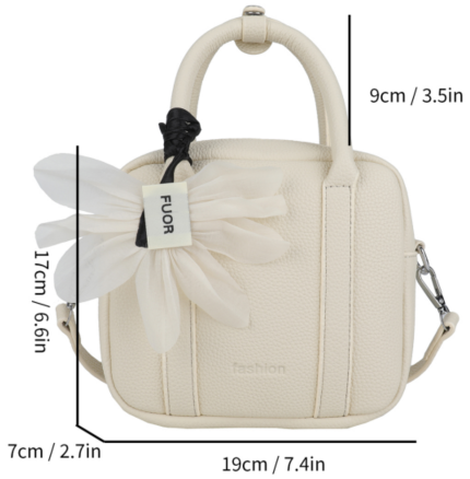 A compact top-handle bag crafted from premium textured leather, elevated by a delicate organza flower detail. Versatile (handheld or crossbody) and effortlessly chic for daily elegance.#5619