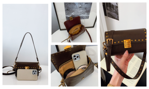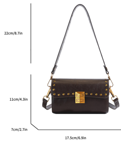 This crossbody bag reimagines retro sophistication through thoughtful craftsmanship. Made from supple, smooth leather, its slim silhouette is elevated by polished stud accents that add subtle texture without overstatement—while the bold gold-tone clasp serves as a striking focal point, merging vintage flair with modern refinement.